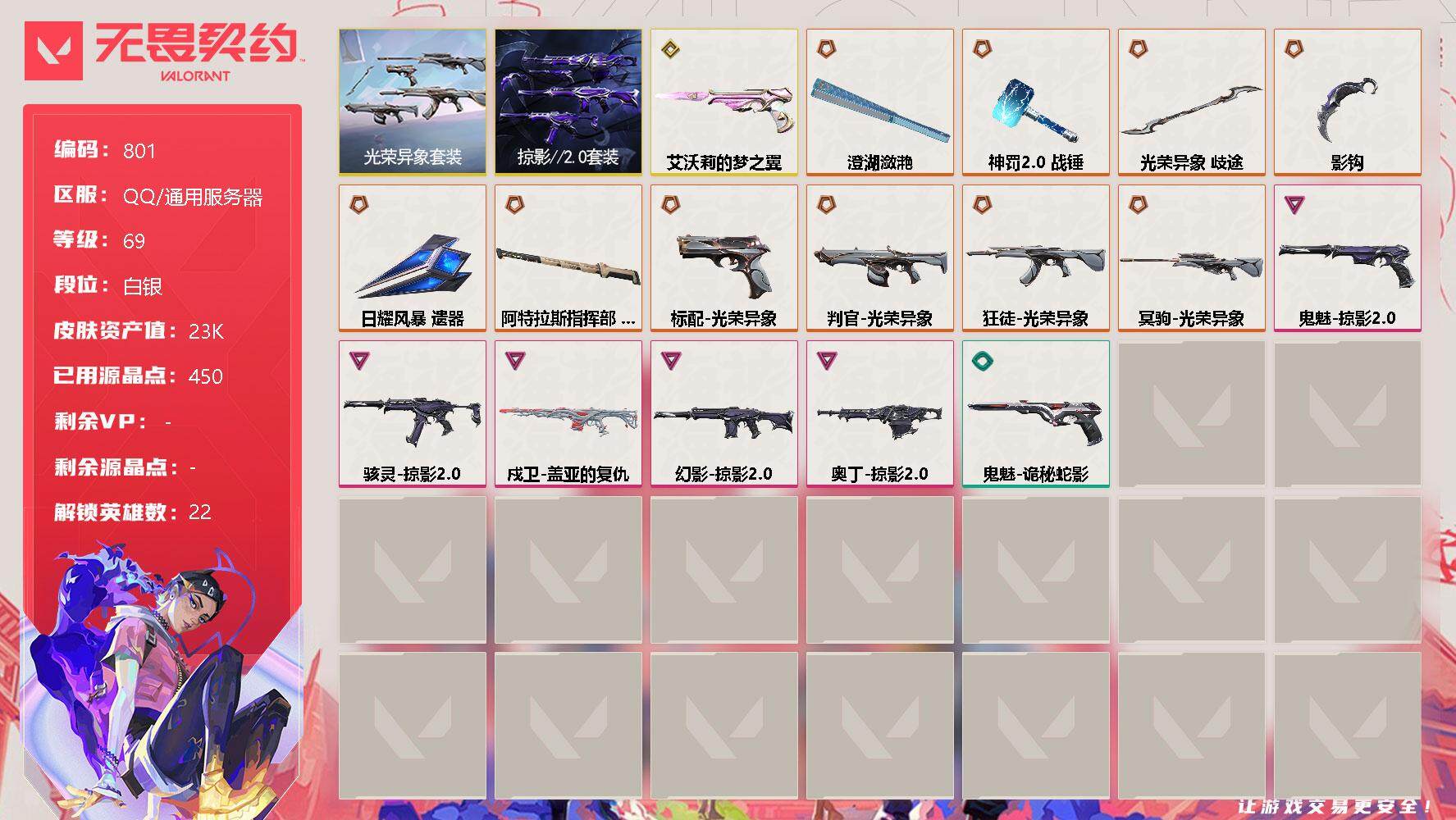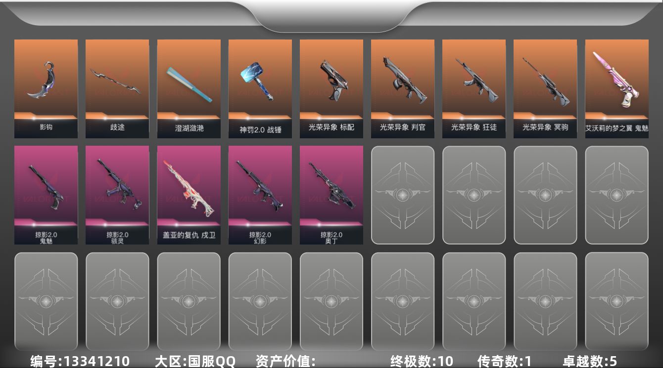 [13341210]【套装】:光荣异象套装,掠影//2.0套装 【英雄】:炼狱,暮蝶,钛狐,壹决,铁臂,捷风,雷兹,不死鸟,贤者,猎枭,芮娜,奇乐,尚勃勒,霓虹,斯凯,夜露,K/O,海神,盖可,黑梦,钢锁 【近战 武器】:近战武器-影钩,近战武器-光荣异象 歧途,近战武器-澄湖潋滟,近战武器-神罚//2.0 战锤,近战武器-日耀风暴 遗器,近战武器-阿特拉斯指挥部 甩棍 【狂徒】:狂徒-光荣异象 【幻影】:幻影-掠影//2.0 【戍卫】:戍卫-盖亚的复仇 【冥驹】:冥驹-光荣异象 【奥丁】:奥丁-掠影//2.0 【判官】:判官-光荣异象 【骇灵】:骇灵-掠影//2.0 【标配】:标配-光荣异象 【鬼魅】:鬼魅-艾沃莉的梦之翼,鬼魅-掠影//2.0,鬼魅-诡秘蛇影 【卡面】:树懒大作战 卡面,无畏契约GO!第一卷:芮娜 卡面,无畏契约GO!第一卷:零 卡面,无垠星环 卡面,《双城之战》金克丝 卡面,代号红色 卡面,新兵报到 卡面,V契约 卡面,无畏契约 卡面 【喷漆】:买装还是存钱 喷漆,放下武器 喷漆,胜利属于无畏契约 喷漆,GLHF 喷漆,无畏契约 喷漆 【挂饰】:动力机箱 挂饰,天外飞客 挂饰,无畏契约 纪念币 挂饰
