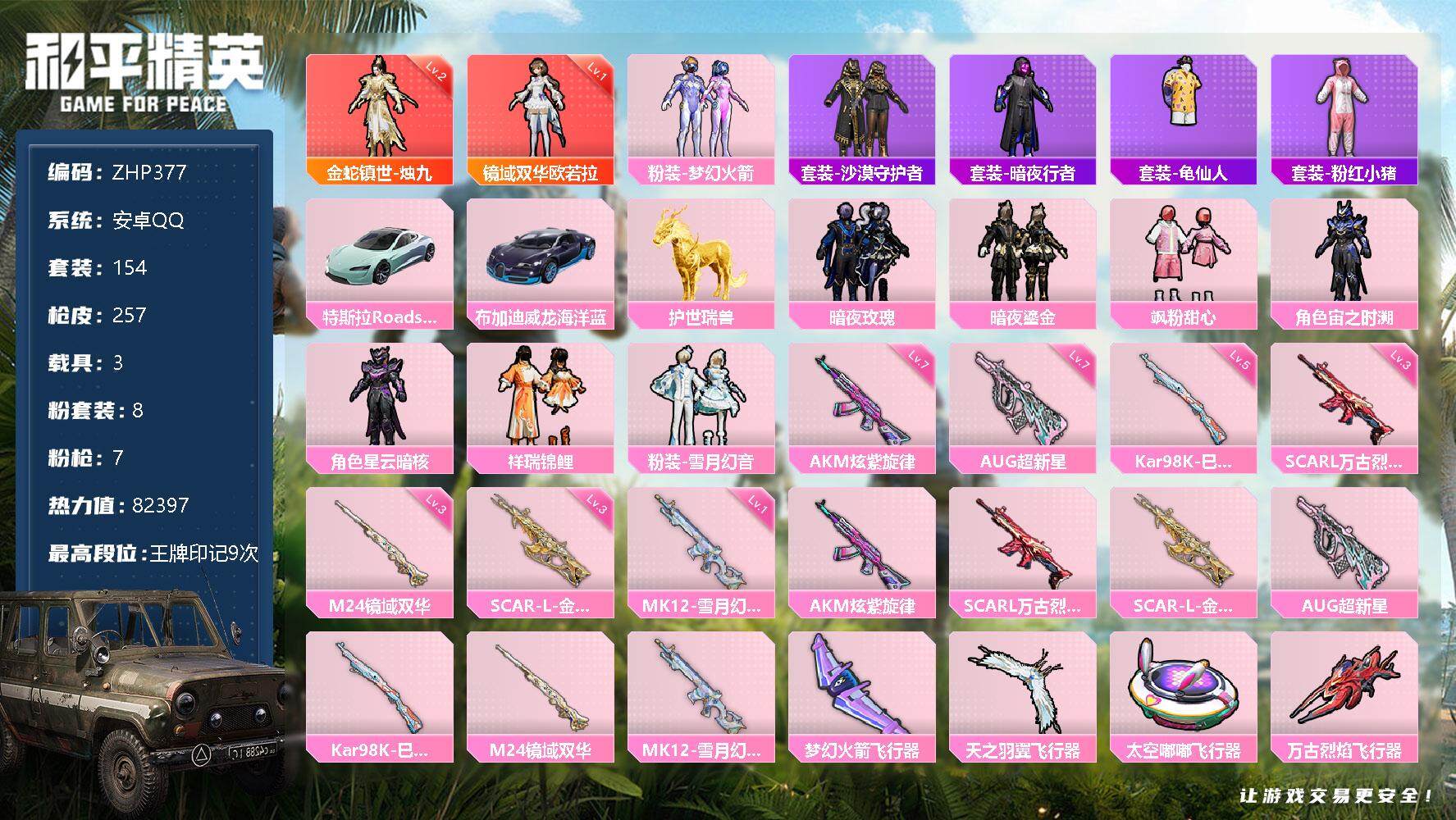 [13346700]【店主推荐捡漏号!可直接换绑】/素材身法号/地铁满天赋 安卓 手Q-2神装-8粉装-7特效枪-3载具-6粉色飞行器-8.2w热力值-9王牌印记-154套装-257枪皮【红色神装等级】:金蛇镇世-烛九(二级),镜域双华-欧若拉(一级)【热门品类】:粉装-梦幻火箭,套装-沙漠守护者,套装-暗夜行者,套装-龟仙人,套装-粉红小猪【粉色载具】:特斯拉Roadster(水滴蓝),布加迪威龙(海洋蓝),护世瑞兽【粉色套装】:粉装-梦幻火箭,粉装-暗夜玫瑰,粉装-暗夜鎏金,粉装-飒粉甜心,角色-宙之时溯,角色-星云暗核,粉装-祥瑞锦鲤,粉装-雪月幻音【粉色枪皮等级】:AKM-炫紫旋律(七级),SCAR-L-万古烈焰(三级),SCAR-L-金蛇镇世(三级),AUG-超新星(七级),Kar98K-巳巳如意(五级),M24-镜域双华(三级),MK12-雪月幻音(一级)【粉色飞行器】:梦幻火箭飞行器,天之羽翼飞行器,太空嘟嘟飞行器,万古烈焰飞行器,镜域双华-灵镜之阶,万象金身飞行器