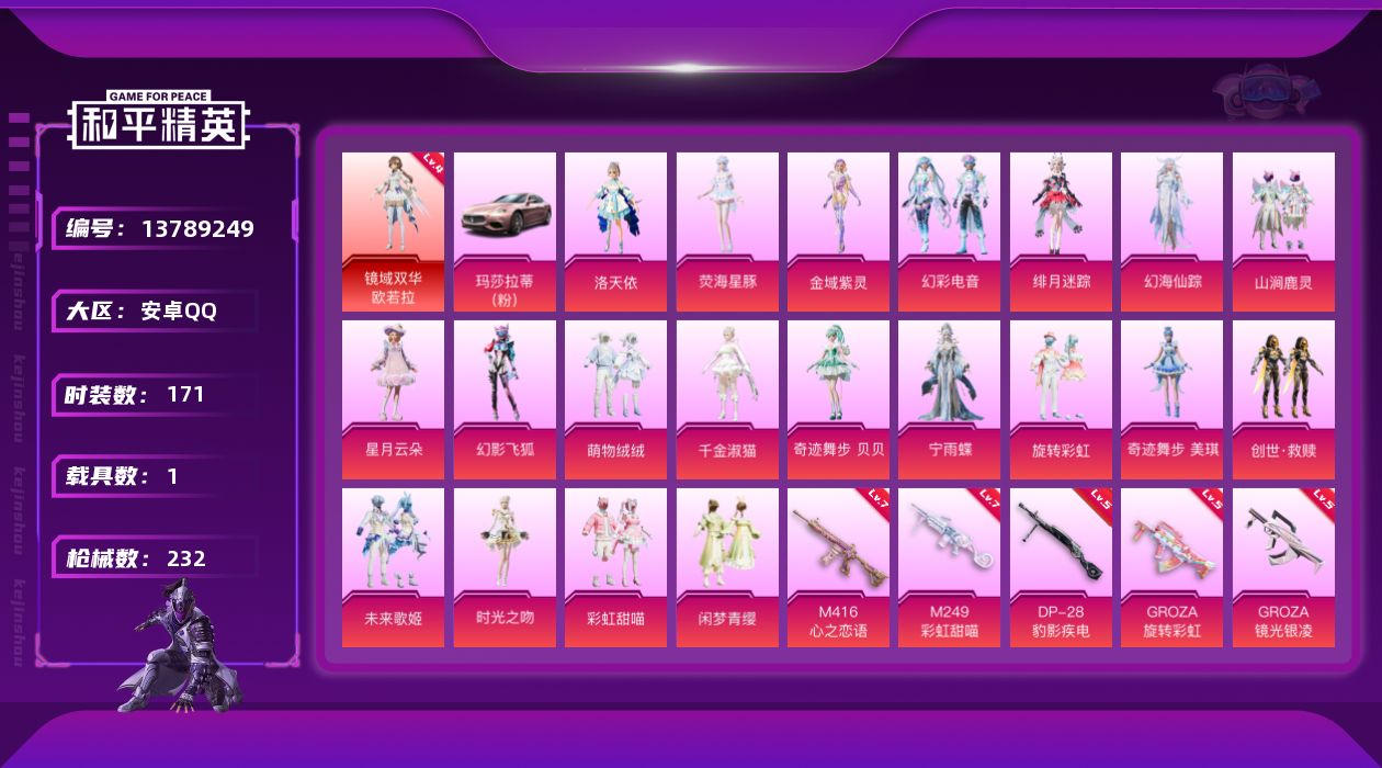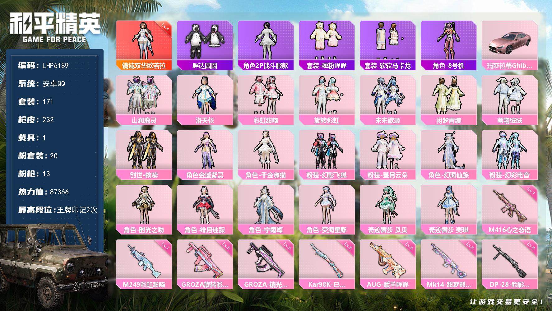 [13789249]【店主推荐捡漏号!可直接换绑】/素材身法号/镜域双华-欧若拉(四级)/地铁满天赋 安卓 手Q-1神装-20粉装-13特效枪-1载具-8粉色飞行器-8.7w热力值-2王牌印记-171套装-232枪皮【红色神装等级】:镜域双华-欧若拉(四级)【热门品类】:套装-胖达圆圆,角色-2P战斗服款,套装-糯粉咩咩,套装-软软马卡龙,角色-8号机【粉色载具】:玛莎拉蒂Ghibli(粉)【粉色套装】:粉装-山涧鹿灵,角色-洛天依,粉装-彩虹甜喵,粉装-旋转彩虹,粉装-未来歌姬,粉装-闲梦青缨,粉装-萌物绒绒,套装-创世·救赎,角色-金域紫灵,角色-千金淑猫,粉装-幻影飞狐,粉装-星月云朵,角色-幻海仙踪,粉装-幻彩电音,角色-时光之吻,角色-绯月迷踪,角色-宁雨蝶,角色-荧海星豚,角色-奇迹舞步 贝贝,角色-奇迹舞步 美琪【粉色枪皮等级】:AKM-幽焰骑士(三级),M416-心之恋语(七级),GROZA-旋转彩虹(五级),GROZA-镜光银凌(五级),AUG-暖羊咩咩(五级),Vector-最终圣卫者(三级),Kar98K-未来歌姬(一级),Kar98K-巳巳如意(五级),Mk14-甜梦熊击(五级),M249-彩虹甜喵(七级),DP-28-圣堂之誓(一级),DP-28-豹影疾电(五级)【粉色飞行器】:酣梦熊熊飞行器,萌物绒绒飞行器,镜域双华-灵镜之阶,幽焰列车飞行器,时光之吻飞行器,奇迹舞步飞行器,飞天猪飞行器