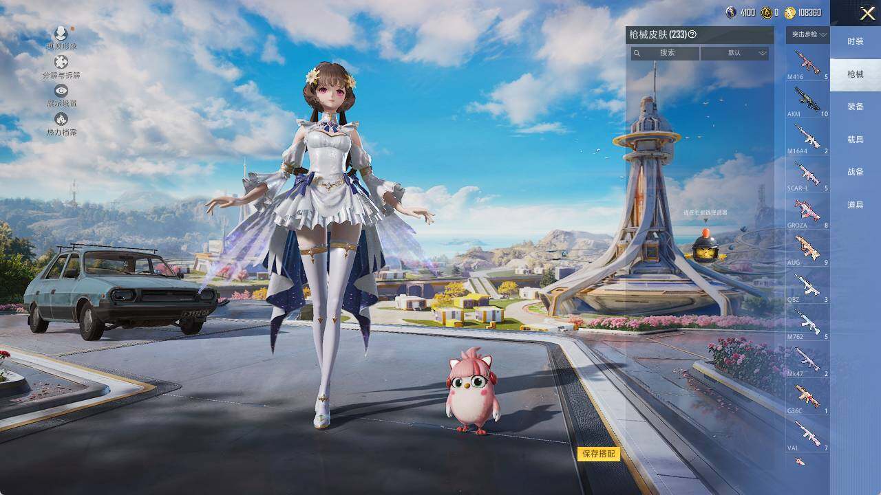 AKM-幽焰骑士,M416-心之恋语,GROZA-旋转彩虹,GROZA-镜光银凌,AUG-暖羊咩咩,Kar98K-未来歌姬,Kar98K-巳巳如意,M249-彩虹甜喵,DP-28-圣堂之誓,破片手榴弹-粉粉猫爪