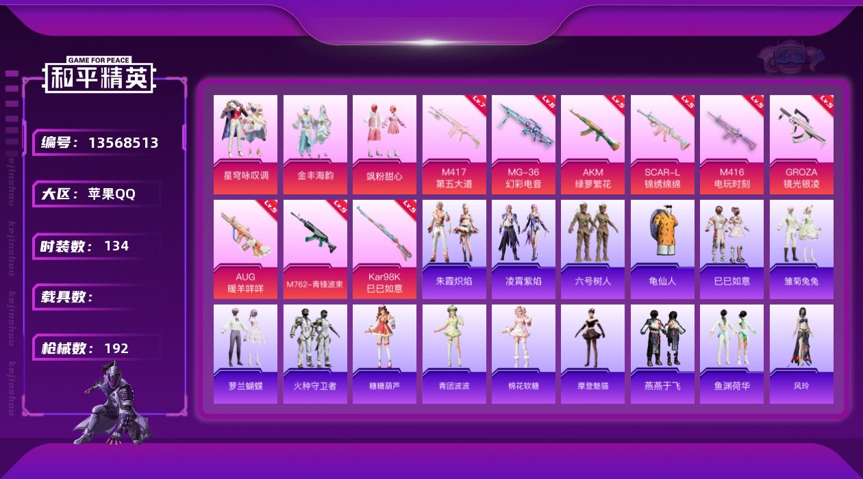 [13568513]地铁满天赋【暑期末清货/特价急出/永久包赔】:苹果 手Q-3粉装-10特效枪-5.9w热力值-13印记-134套装-192枪皮【热门品类】:套装-六号树人【特效枪等级】:AKM-绿萝繁花(五级),SCAR-L-锦绣绵绵(五级),M416-电玩时刻(五级),GROZA-镜光银凌(五级),AUG-暖羊咩咩(五级),M762-青锋波束(五级),Kar98K-巳巳如意(五级),Mk14-甜梦熊击(五级),M417-第五大道(七级),MG-36-幻彩电音(六级)【优质套装】:粉装-飒粉甜心,粉装-金丰海韵,粉装-星穹咏叹调【优质飞行器】:繁龙极客飞行器