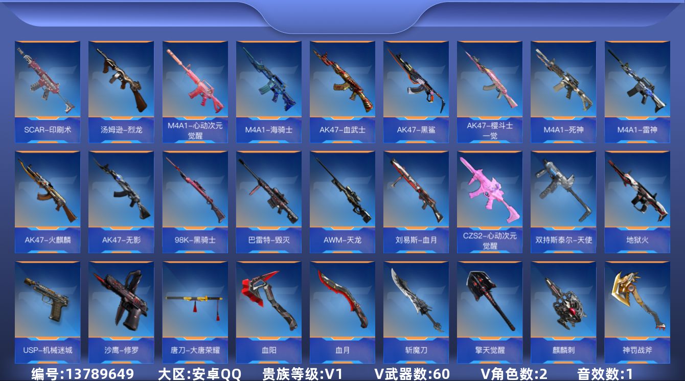 [13789649]暑期末清货/特价急出/永久包赔/商品详情看图/VIP1/60V/2王者 M4A1-心动次元觉醒,AK47-黑鲨,屠龙,马来剑-毁灭,神罚战斧,麒麟刺,AK47-樱斗士-一觉,擎天觉醒,沙鹰-修罗,血阳,斩魔刀,血月,Mk47-鼓龙,秋逸,98K-星神,SCAR-探星者,QSZ92-华夏传说,QBB95-极光,SCAR-印刷术,改装GLOCK-木兰,唐刀-大唐荣耀,USP-机械迷城,QCW05-变形金刚·大黄蜂,M1216-血月,CZS2-血月,M4A1-雷神,AK47-无影,M4A1-死神,AK47-血武士,M4A1-海骑士,AK47-火麒麟,地狱火,汤姆逊-烈龙,双持斯泰尔-天使,98K-黑骑士,CZS2-心动次元觉醒,刘易斯-血月,AWM-天龙,巴雷特-毁灭,木兰,葵,炽天使X,AK47-无影-电音