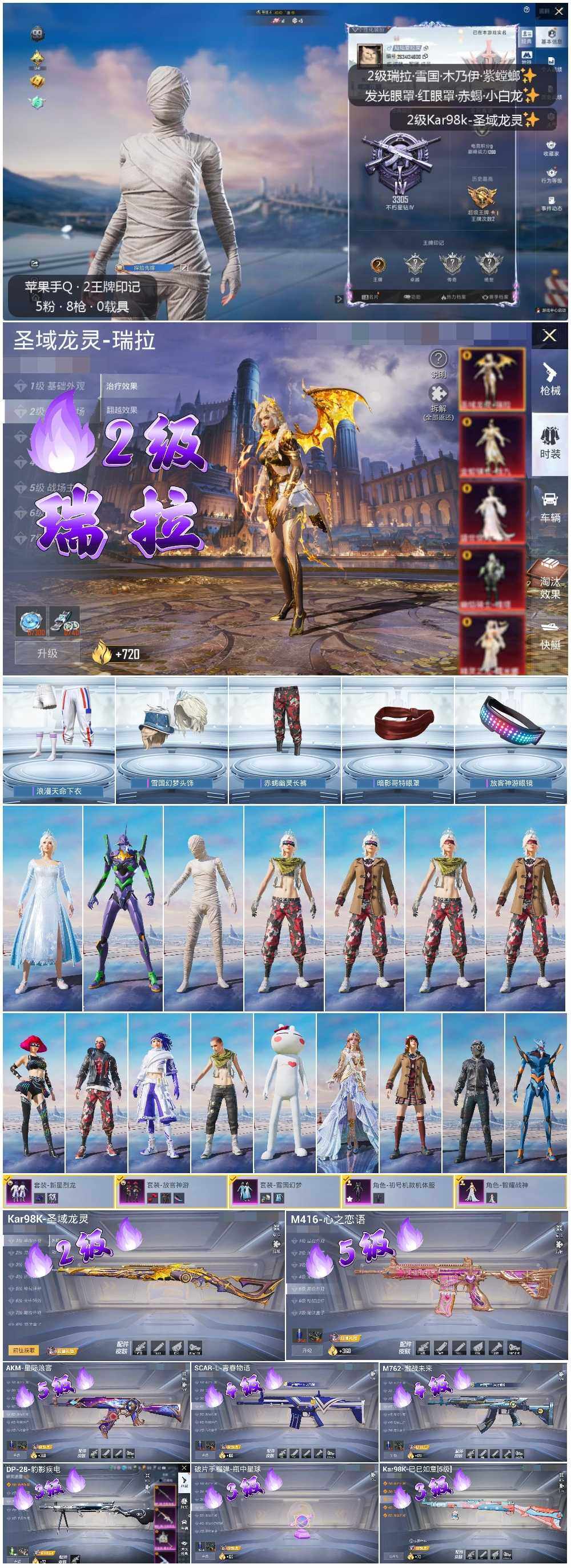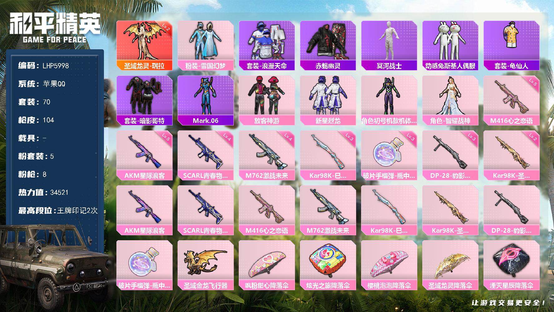 [13790379]可二次【店主推荐捡漏号!可直接换绑】/素材身法号/老木乃伊 苹果 手Q-1神装-5粉装-8特效枪-1粉色飞行器-3.4w热力值-2王牌印记-70套装-104枪皮【红色神装等级】:圣域龙灵-瑞拉(二级)【热门品类】:粉装-雪国幻梦,套装-浪漫天命,套装-赤蝎幽灵,套装-冥河战士,套装-动感兔斯基人偶服,套装-龟仙人,套装-暗影哥特,角色-Mark.06【粉色套装】:粉装-雪国幻梦,粉装-放客神游,粉装-新星烈龙,角色-初号机款机体服,角色-智耀战神【粉色枪皮等级】:AKM-星际浪客(五级),SCAR-L-青春物语(四级),M416-心之恋语(五级),M762-激战未来(四级),Kar98K-巳巳如意(三级),Kar98K-圣域龙灵(二级),DP-28-豹影疾电(三级),破片手榴弹-瓶中星球(三级)【粉色飞行器】:圣域金龙飞行器