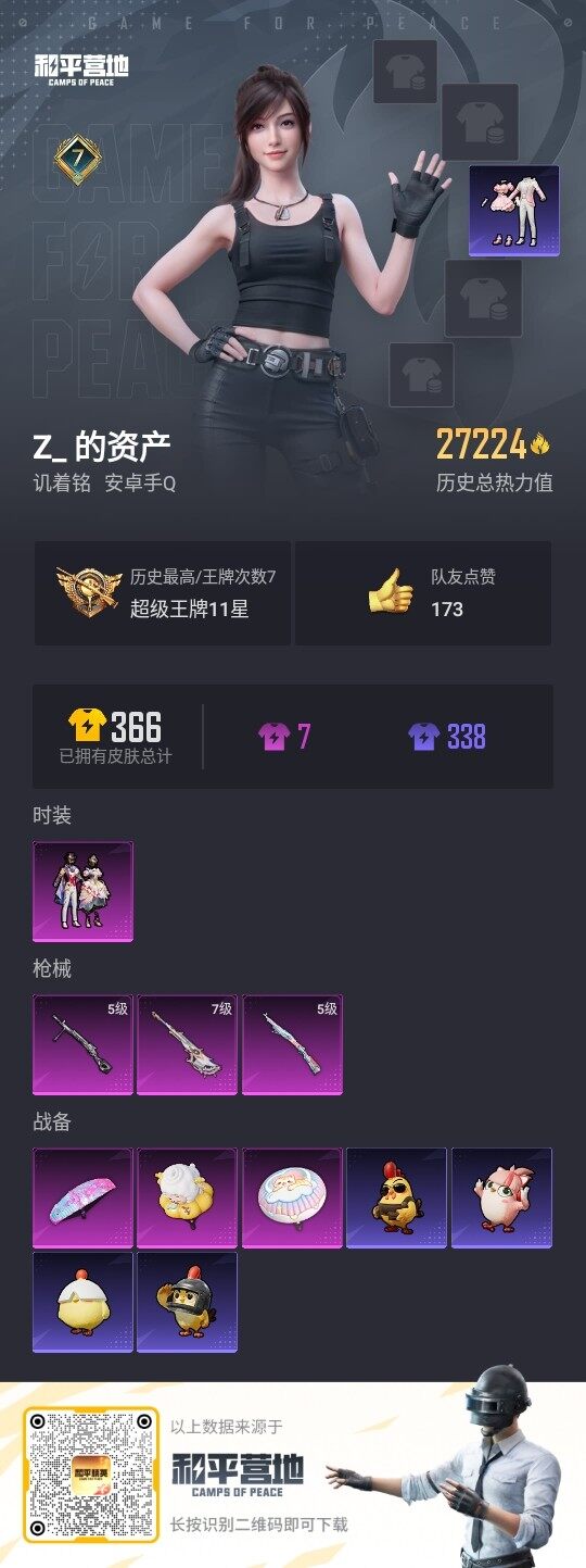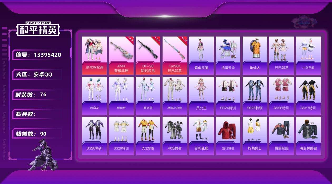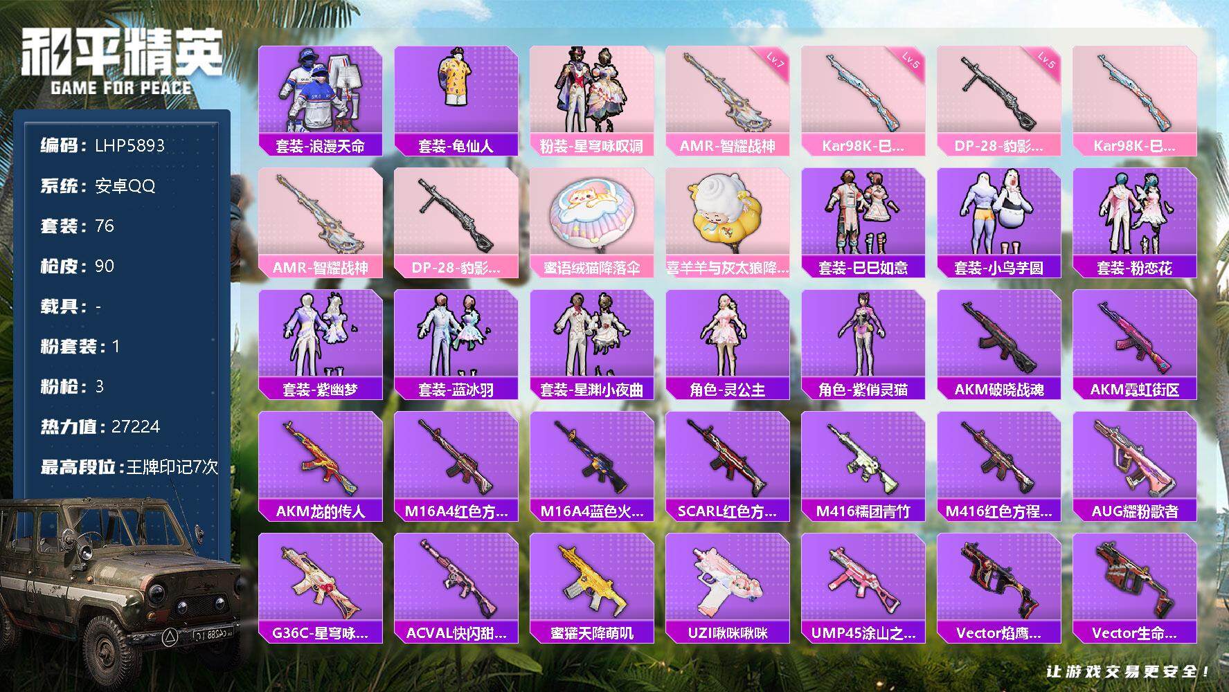 [13395420]可二次【店主推荐捡漏号!可直接换绑】安卓 手Q-1粉装-3特效枪-2.7w热力值-7王牌印记-76套装-90枪皮【热门品类】:套装-浪漫天命,套装-龟仙人【粉色套装】:粉装-星穹咏叹调【粉色枪皮等级】:Kar98K-巳巳如意(五级),AMR-智耀战神(七级),DP-28-豹影疾电(五级)