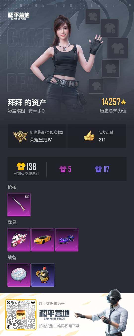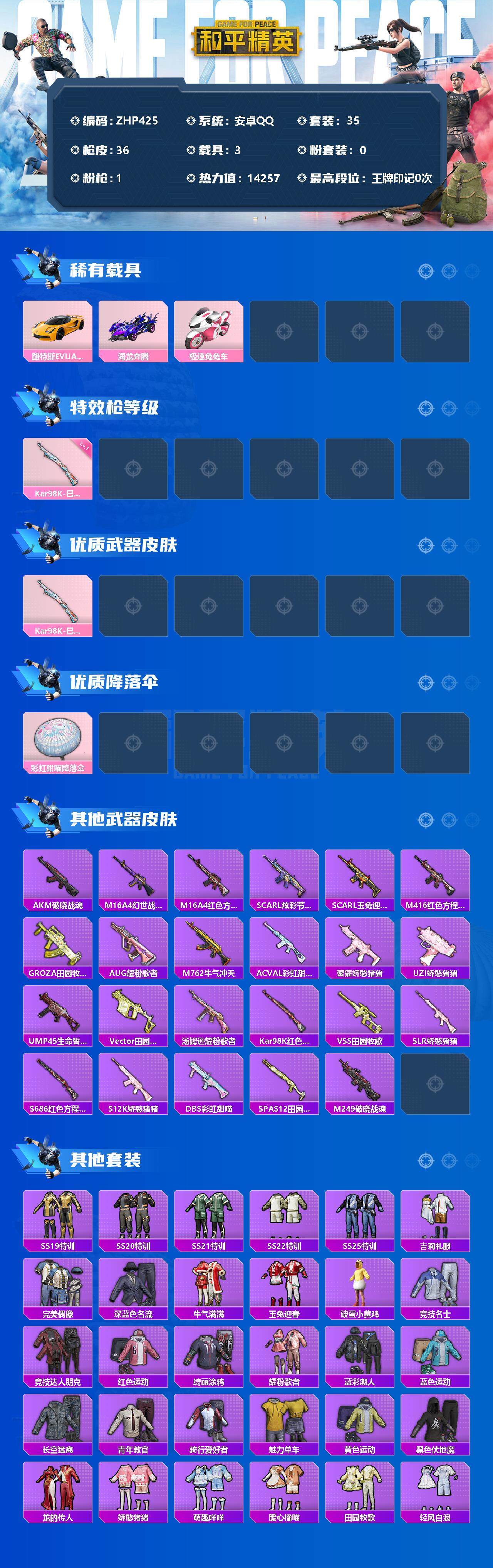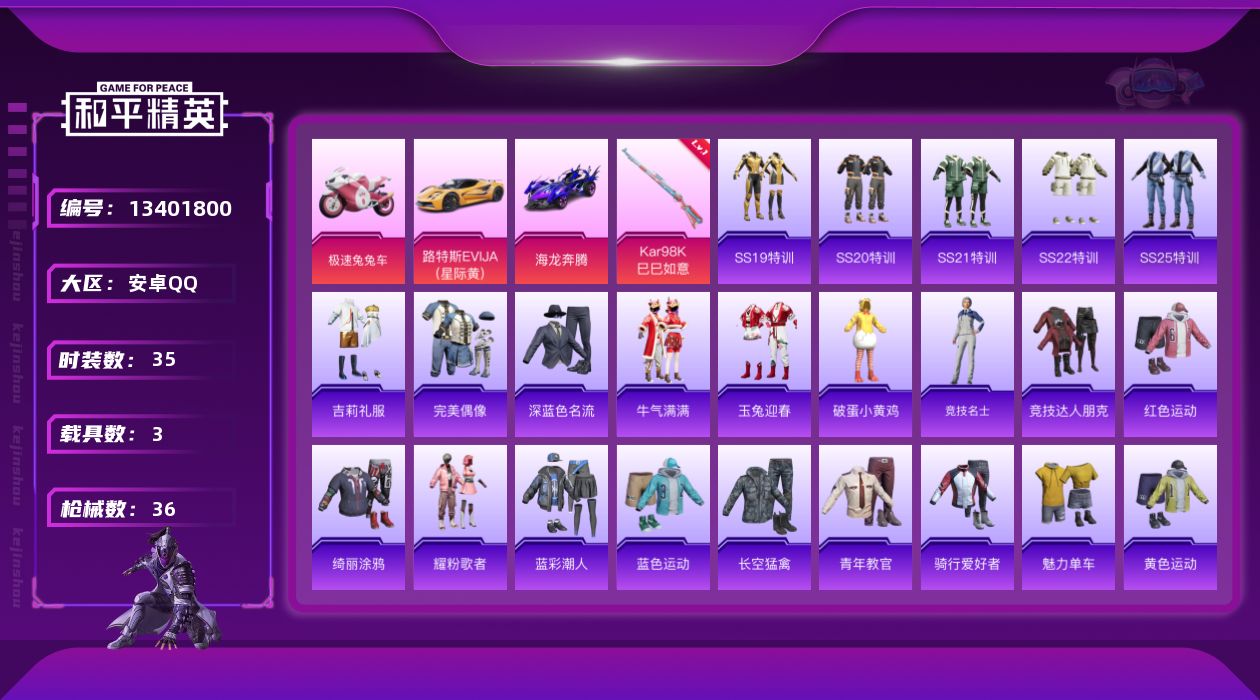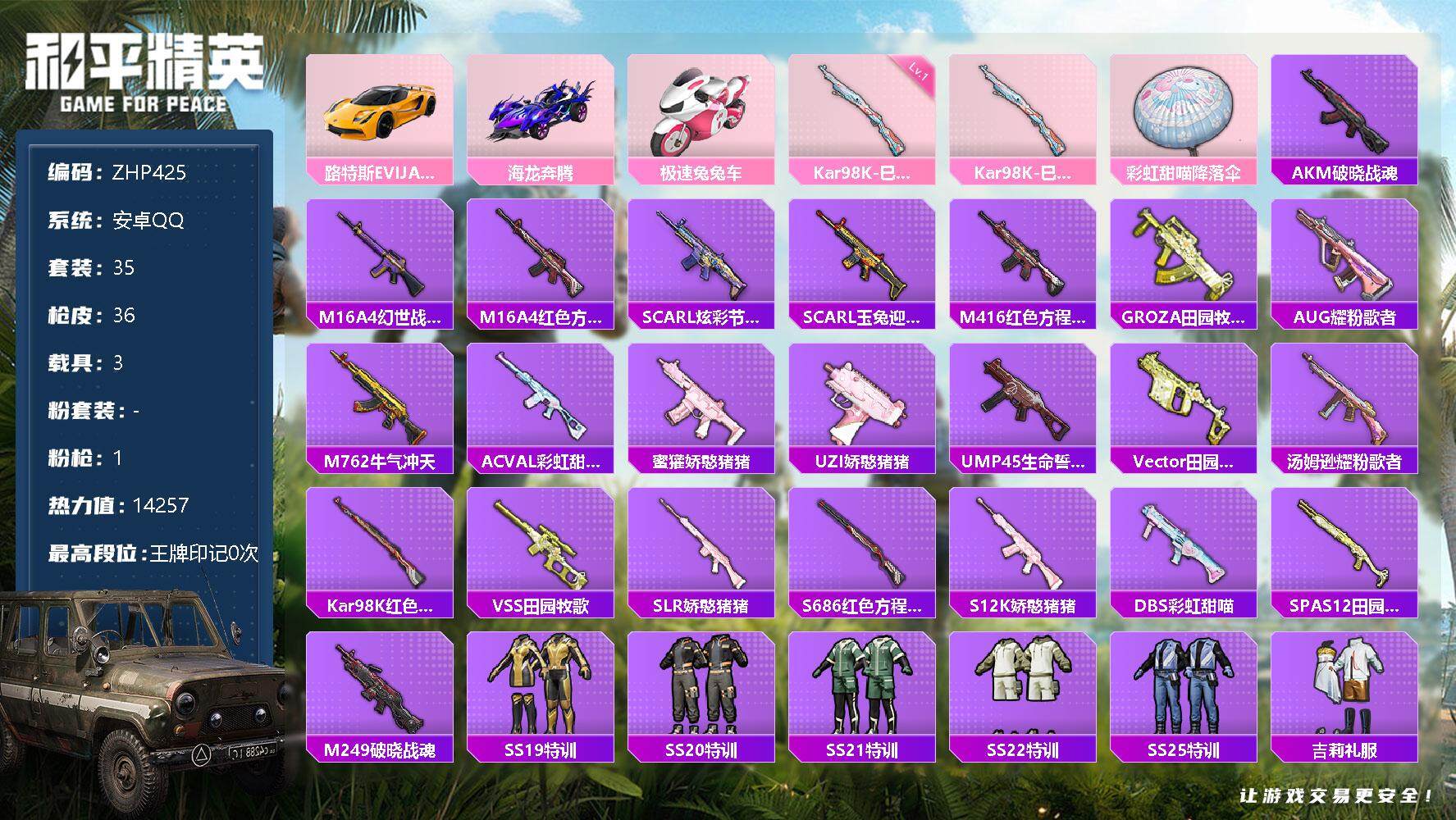[13401800]可二次【店主推荐捡漏号!可直接换绑】 安卓 手Q-1特效枪-3载具-1.4w热力值-1王牌印记-35套装-36枪皮【粉色载具】:路特斯EVIJA(星际黄),海龙奔腾,极速兔兔车【粉色枪皮等级】:Kar98K-巳巳如意(一级)