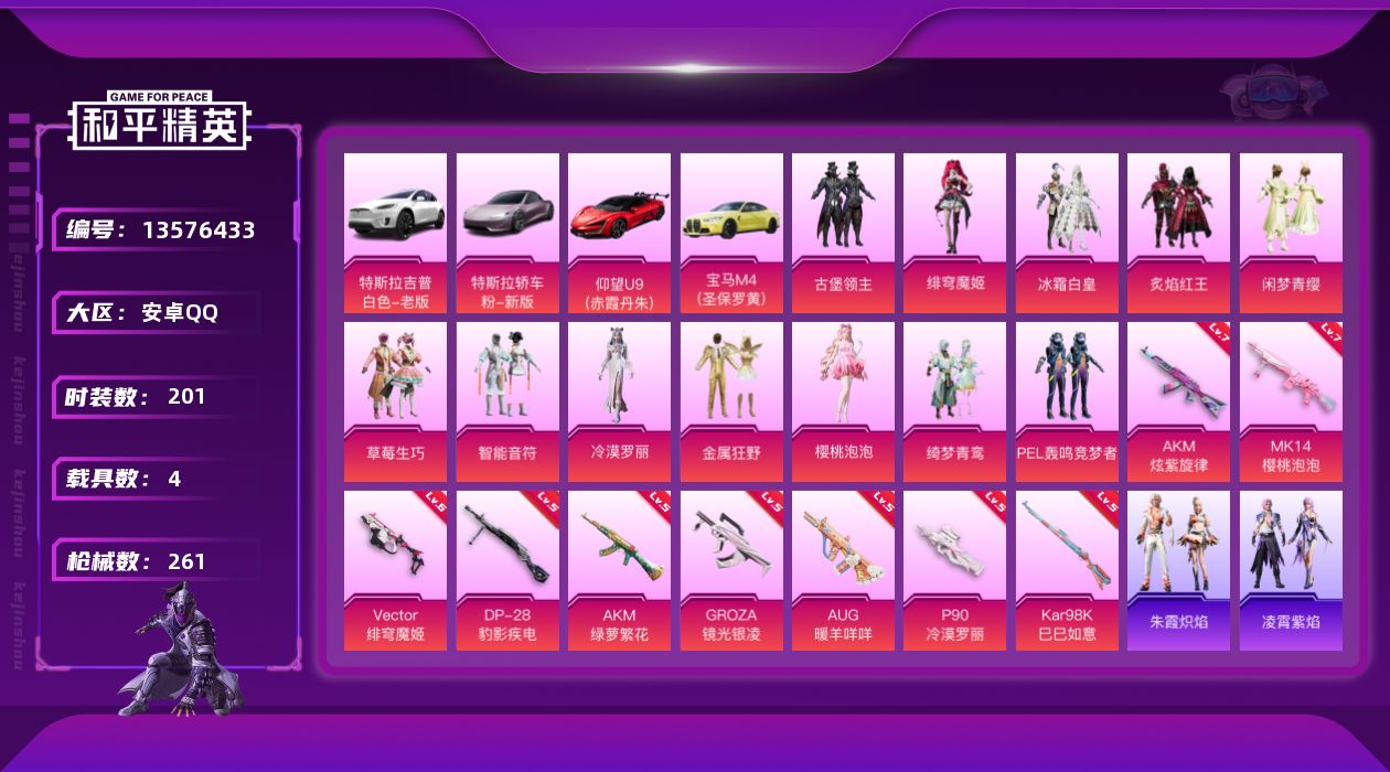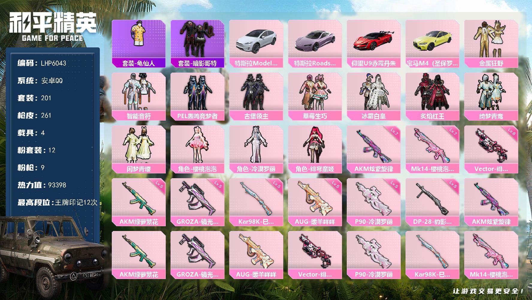 [13576433]可二次【店主推荐捡漏号!可直接换绑】/素材身法号/地铁满天赋 安卓 手Q-12粉装-9特效枪-4载具-4粉色飞行器-9.3w热力值-12王牌印记-201套装-261枪皮【热门品类】:套装-龟仙人,套装-暗影哥特【粉色载具】:特斯拉Model X(珍珠白),特斯拉Roadster(沁心粉),仰望U9(赤霞丹朱),宝马M4(圣保罗黄)【粉色套装】:粉装-金属狂野,粉装-智能音符,粉装-PEL轰鸣竞梦者,粉装-古堡领主,粉装-草莓生巧,粉装-冰霜白皇,粉装-炙焰红王,粉装-绮梦青鸾,粉装-闲梦青缨,角色-樱桃泡泡,角色-冷漠罗丽,角色-绯穹魔姬【粉色枪皮等级】:AKM-炫紫旋律(七级),AKM-绿萝繁花(五级),GROZA-镜光银凌(五级),AUG-暖羊咩咩(五级),Vector-绯穹魔姬(六级),P90-冷漠罗丽(五级),Kar98K-巳巳如意(五级),Mk14-樱桃泡泡(七级),DP-28-豹影疾电(五级)【粉色飞行器】:炫紫旋律飞行器,PEL轰鸣竞梦者飞行器,神秘黑猫飞行器,夏日绵绵冰飞行器