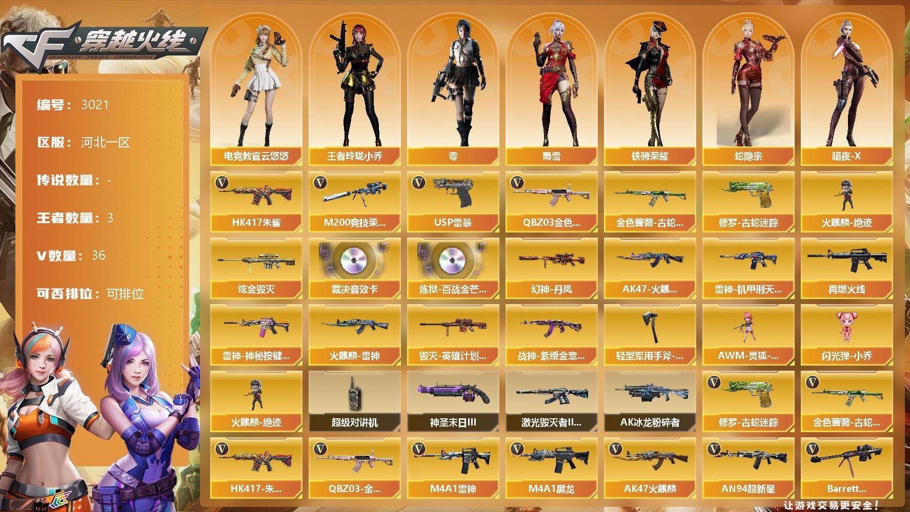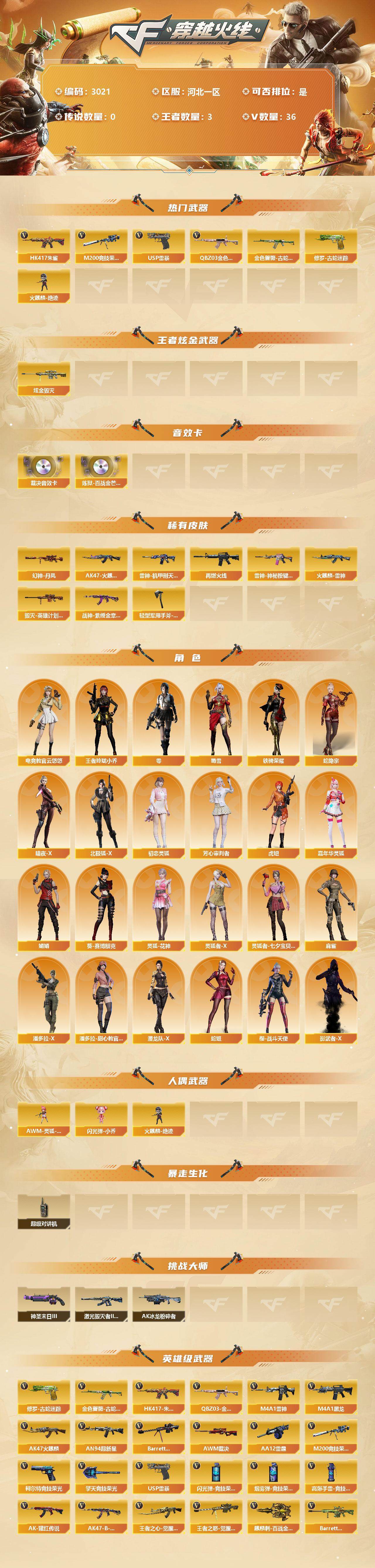 [13432790]河北一区-36V-3王者-1炫金 【热门武器】:QBZ03-金色蔷薇,HK417-朱雀,金色蔷薇-古蛇迷踪,修罗-古蛇迷踪,M200-竞技荣光,火麒麟-绝迹,USP-雷暴 【王者炫金武器】:炫金毁灭 【音效卡】:AWM-裁决音效卡,炼狱-百战金芒-庆典舞曲音效卡 【皮肤】:幻神-丹凤,雷神-机甲刑天皮肤,M4A1-再燃火线,雷神-神秘按键 皮肤,火麒麟-雷神,AK47-火麒麟-传奇EVEN,毁灭-英雄计划 皮肤,战神-紫绶金章皮肤,轻型军用手斧-再燃火线 【角色】:零,电竞教官-云悠悠,王者玲珑-小乔,蛇隐宗,暗夜-X,北极狐-X,初恋灵狐,芳心审判者,虎妞,嘉年华灵狐,娟娟,葵-赛博朋克,灵狐-花神,灵狐者-X,灵狐者-七夕宝贝,麻雀,潘多拉-X,潘多拉-甜心教官,潜龙队-X,蛇姬,蜀雪,铁骑荣耀,樱-战斗天使,影武者-X 【人偶武器】:火麒麟-绝迹,AWM-灵狐-15周年嘉年华,闪光弹-小乔 【暴走生化】:超级对讲机 【挑战大师】:AK47-冰龙粉碎者,激光毁灭者III-白马银枪,神圣爆裂者-末日III 【英雄级武器】:AK47-火麒麟,M4A1-黑龙,M4A1-雷神,AN94-超新星,HK417-朱雀,金色蔷薇-古蛇迷踪,QBZ03-金色蔷薇,王者之心-觉醒版,AK-47-猩红传说*5,AK47-B-战神,Barrett-毁灭,AWM-裁决,M200-竞技荣光,王者之怒-觉醒版,AA-12-雷霆,USP-雷暴,柯尔特-竞技荣光,修罗-古蛇迷踪,擎天-竞技荣光,麒麟刺-百战金芒,高爆手雷-雷霆,高爆手雷-竞技荣光,高爆手雷-古蛇迷踪,闪光弹-雷霆,闪光弹-竞技荣光,烟雾弹-雷霆,烟雾弹-竞技荣光,烟雾弹-古蛇迷踪,Barrett-碧霄极光 【道具】:BS战队炫彩背包,古蛇迷踪炫彩背包,炫彩背包,百战金芒炫彩背包,老虎背包,超级背包,女皇终结者-魔龙之吻,黄金生化钩,绿色巨人,灵魂忍者,变异宝贝,迷雾幽灵,夺命之镰,防化服*4,金色流光-枪王排位,枪王排位29赛季金色流光,语音特效-盛典烟火,古蛇迷踪打击特效,蛇隐宗表情,萌萌小葵表情,防弹头盔*6,防弹衣*8,C4工具钳*5,手雷包*3 【特殊枪械】:
