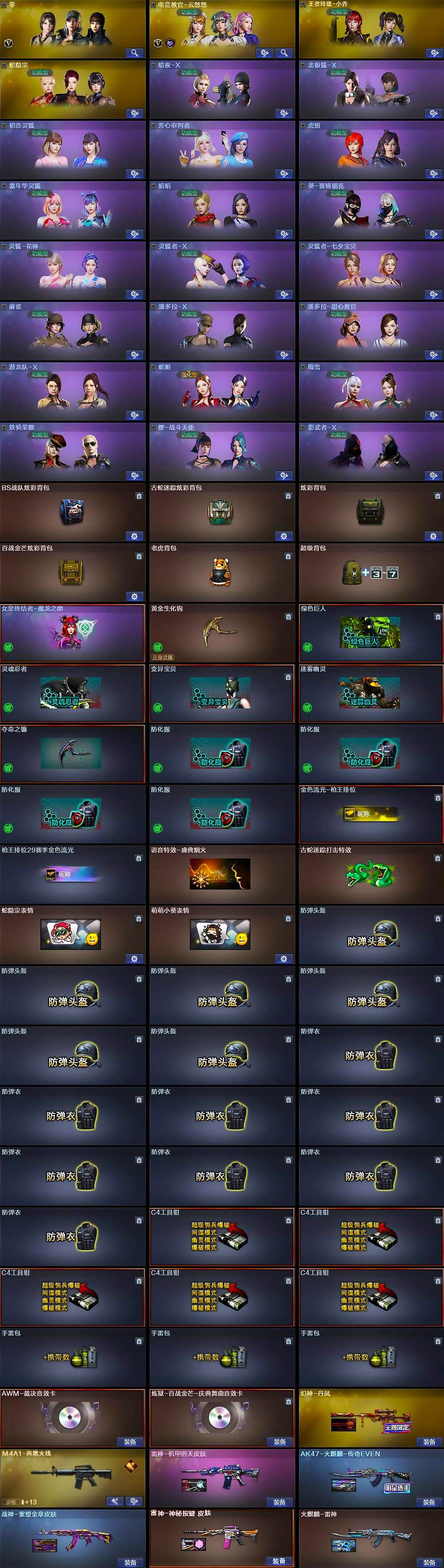 【道具】:BS战队炫彩背包,古蛇迷踪炫彩背包,炫彩背包,百战金芒炫彩背包,老虎背包,超级背包,女皇终结者-魔龙之吻,黄金生化钩,绿色巨人,灵魂忍者,变异宝贝,迷雾幽灵,夺命之镰,防化服*4,金色流光-枪王排位,枪王排位29赛季金色流光,语音特效-盛典烟火,古蛇迷踪打击特效,蛇隐宗表情,萌萌小葵表情,防弹头盔*6,防弹衣*8,C4工具钳*5,手雷包*3