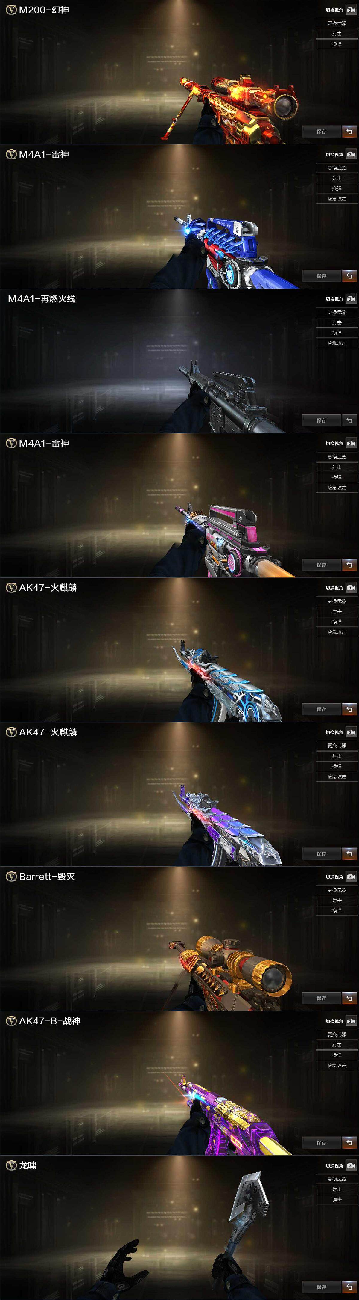 【皮肤】:幻神-丹凤,雷神-机甲刑天皮肤,M4A1-再燃火线,雷神-神秘按键 皮肤,火麒麟-雷神,AK47-火麒麟-传奇EVEN,毁灭-英雄计划 皮肤,战神-紫绶金章皮肤,轻型军用手斧-再燃火线