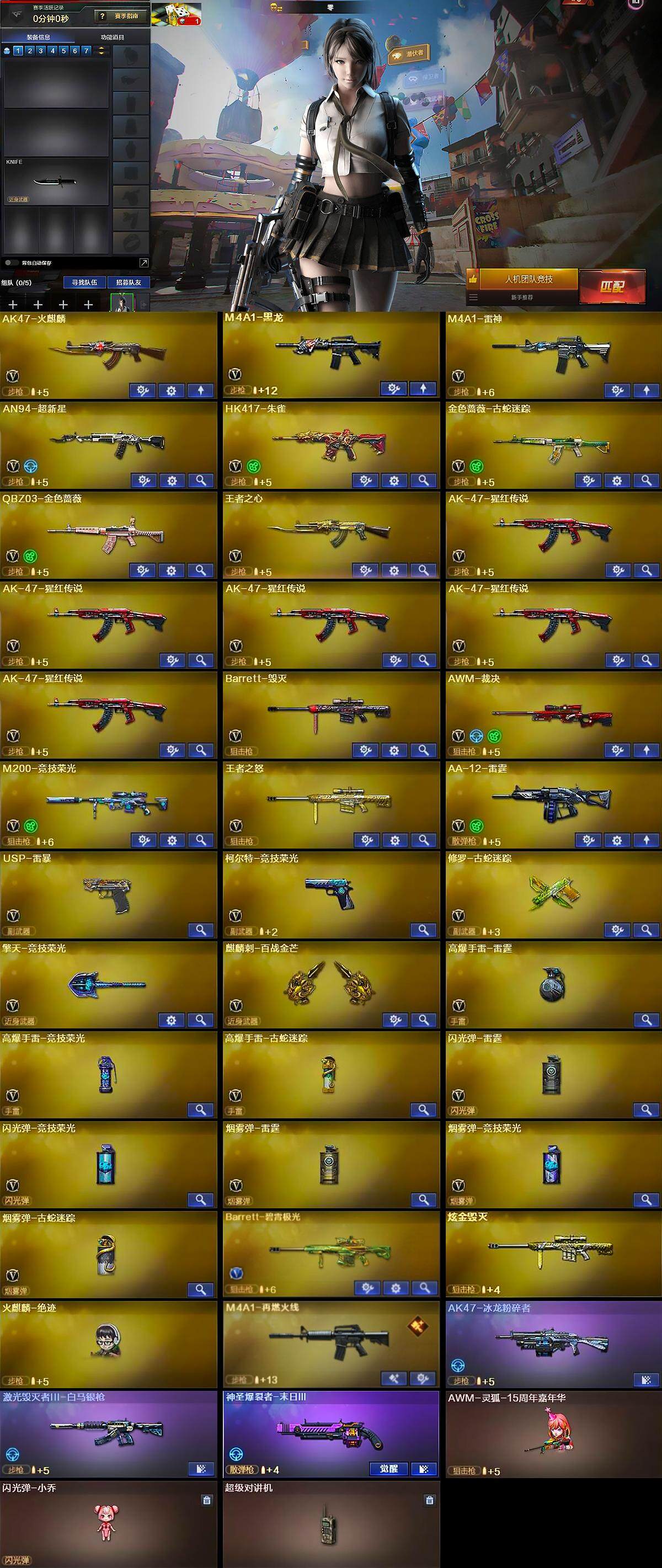 【英雄级武器】:AK47-火麒麟,M4A1-黑龙,M4A1-雷神,AN94-超新星,HK417-朱雀,金色蔷薇-古蛇迷踪,QBZ03-金色蔷薇,王者之心-觉醒版,AK-47-猩红传说*5,AK47-B-战神,Barrett-毁灭,AWM-裁决,M200-竞技荣光,王者之怒-觉醒版,AA-12-雷霆,USP-雷暴,柯尔特-竞技荣光,修罗-古蛇迷踪,擎天-竞技荣光,麒麟刺-百战金芒,高爆手雷-雷霆,高爆手雷-竞技荣光,高爆手雷-古蛇迷踪,闪光弹-雷霆,闪光弹-竞技荣光,烟雾弹-雷霆,烟雾弹-竞技荣光,烟雾弹-古蛇迷踪,Barrett-碧霄极光