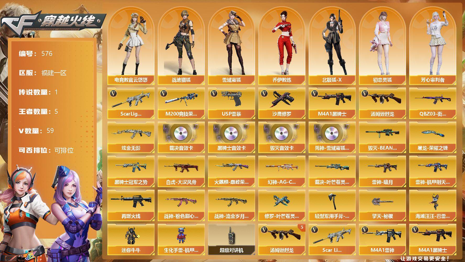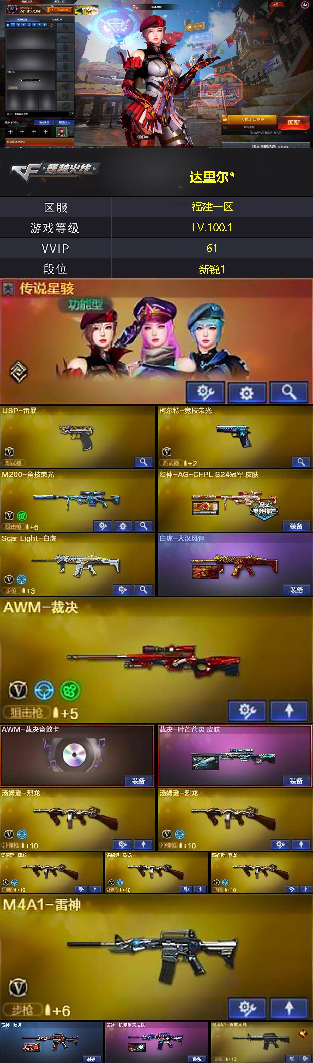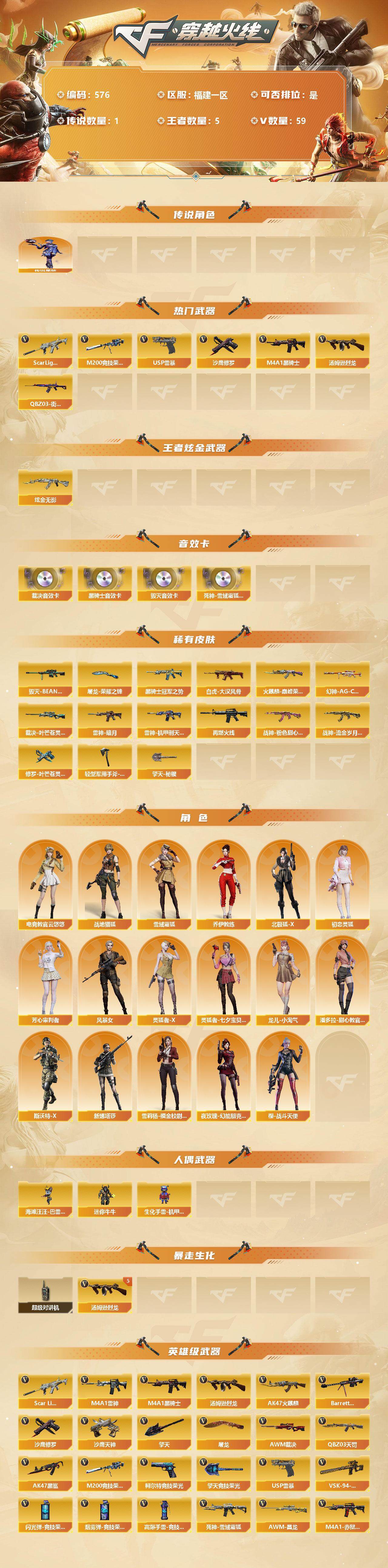 [13455080]福建一区-59V-5王者-1炫金 【传说角色】:传说星骇 【热门武器】:Scar Light-白虎,M200-竞技荣光,QBZ03-街机,M4A1-黑骑士,汤姆逊-烈龙*5,USP-雷暴,沙鹰-修罗*4 【王者炫金武器】:炫金无影 【音效卡】:M4A1-黑骑士音效卡,Barrett-毁灭音效卡,AWM-裁决音效卡,死神-雪域霜狐-怀旧音效卡 【皮肤】:幻神-AG-CFPL S24冠军 皮肤,白虎-大汉风骨,裁决-叶芒苍灵 皮肤,雷神-暗月,雷神-机甲刑天皮肤,M4A1-再燃火线,火麒麟-巅峰荣耀,毁灭-BEAN-2020MVP,黑骑士-冠军之势,战神-粉色甜心皮肤,战神-流金岁月皮肤,修罗-叶芒苍灵 皮肤,屠龙-荣耀之锋,轻型军用手斧-再燃火线,擎天-秘银 【角色】:电竞教官-云悠悠,战地猎狐,雪域霜狐,乔伊教练,北极狐-X,初恋灵狐,芳心审判者,风暴女,灵狐者-X,灵狐者-七夕宝贝,龙儿-小淘气,潘多拉-甜心教官,斯沃特-X,新娜塔莎,雪莉杨-摸金校尉,夜玫瑰-幻能朋克,樱-战斗天使 【人偶武器】:海滩汪汪-巴雷特,迷你牛牛,生化手雷-机甲核心 【暴走生化】:超级对讲机 【英雄级武器】:AK47-火麒麟,M4A1-雷神,M4A1-黑骑士,AK47-黑鲨,Scar Light-白虎,QBZ03-天罚,FAMAS G2-天戎,死神-雪域霜狐,王者猎神-觉醒版,Barrett-毁灭,AWM-裁决,M200-竞技荣光,VSK-94-金蚀,王者之力-觉醒版,王者森决-觉醒版,汤姆逊-烈龙*5,沙鹰-修罗*4,沙鹰-天神,USP-雷暴,柯尔特-竞技荣光,屠龙*5,擎天,擎天-竞技荣光,麒麟刺-百战金芒,高爆手雷-竞技荣光*6,闪光弹-竞技荣光*8,烟雾弹-竞技荣光*7,M4A1-赤狱骑士,AWM-昌龙 【道具】:云山科技背包,炫彩背包,百战金芒炫彩背包,背包-洛丽塔,雪域霜狐炫彩背包,女皇终结者-魔龙之吻,救世主-黑桃战神,绿色巨人,灵魂忍者,变异宝贝,迷雾幽灵,夺命之镰,防化服*3,流光-鎏金之域,流光-再燃火线,枪王排位29赛季金色流光,语音特效-怀旧,雪域霜狐表情,萌萌小葵表情,斯沃特表情,EP战队名片,防弹头盔*6,防弹衣*6,C4工具钳*6,手雷包*6 【特殊枪械】:1白虎,1黑骑士,5烈龙