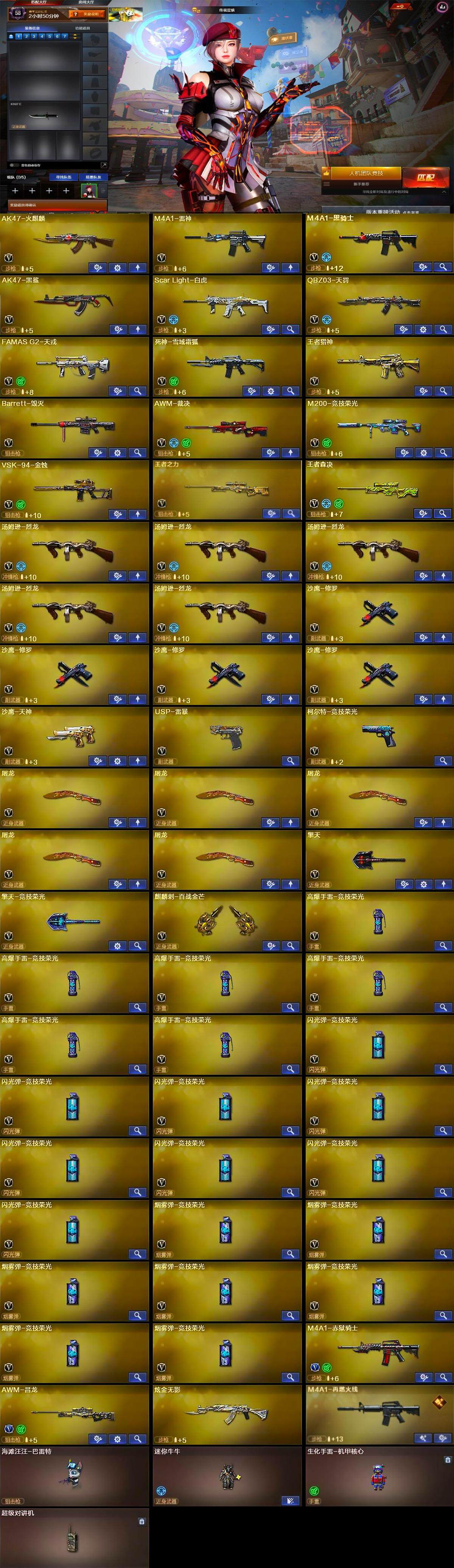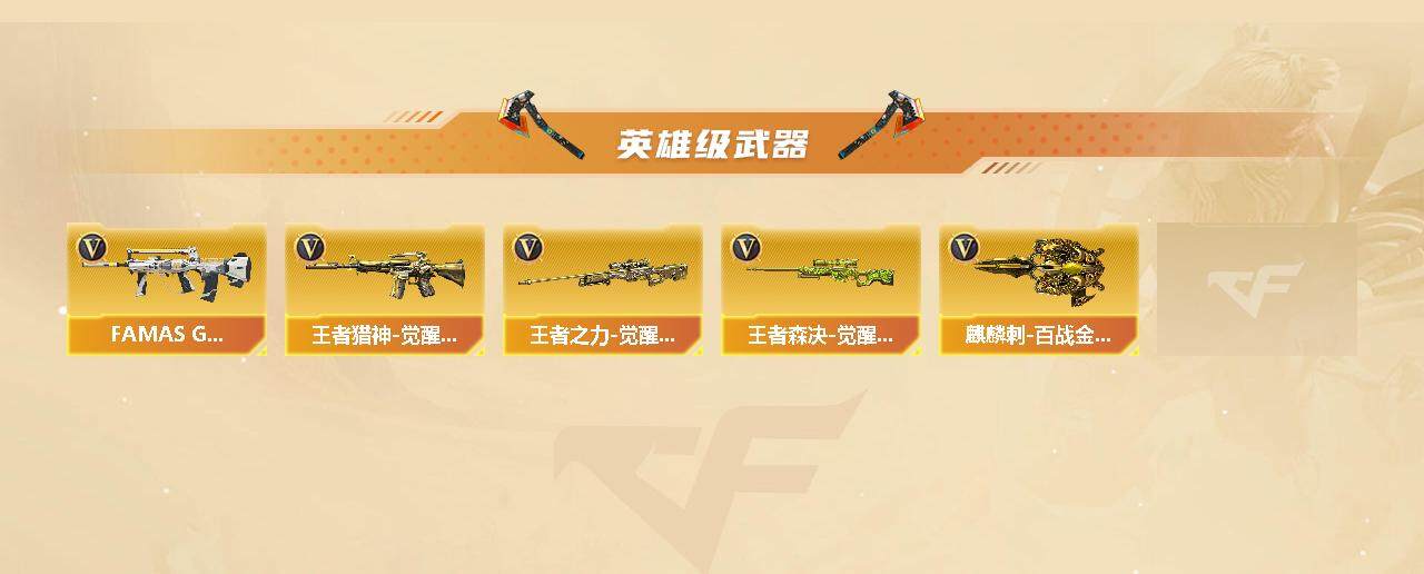 【英雄级武器】:AK47-火麒麟,M4A1-雷神,M4A1-黑骑士,AK47-黑鲨,Scar Light-白虎,QBZ03-天罚,FAMAS G2-天戎,死神-雪域霜狐,王者猎神-觉醒版,Barrett-毁灭,AWM-裁决,M200-竞技荣光,VSK-94-金蚀,王者之力-觉醒版,王者森决-觉醒版,汤姆逊-烈龙*5,沙鹰-修罗*4,沙鹰-天神,USP-雷暴,柯尔特-竞技荣光,屠龙*5,擎天,擎天-竞技荣光,麒麟刺-百战金芒,高爆手雷-竞技荣光*6,闪光弹-竞技荣光*8,烟雾弹-竞技荣光*7,M4A1-赤狱骑士,AWM-昌龙