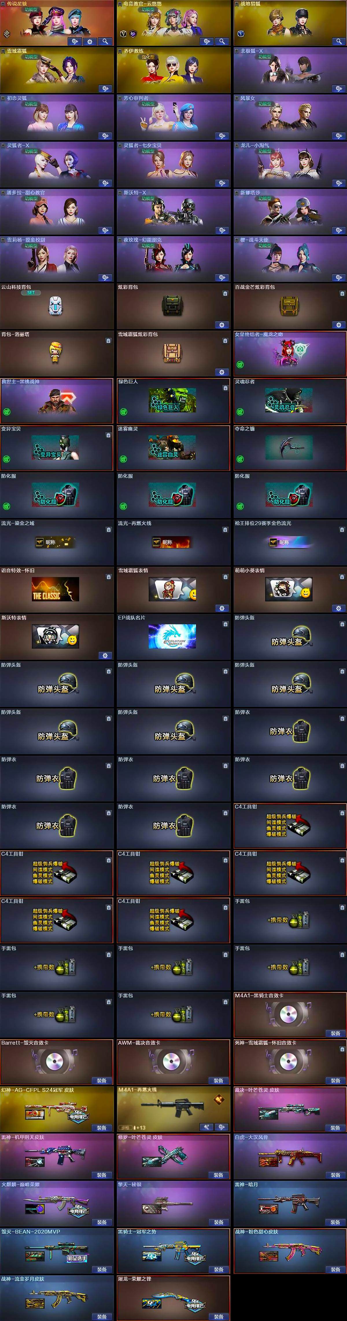 【道具】:云山科技背包,炫彩背包,百战金芒炫彩背包,背包-洛丽塔,雪域霜狐炫彩背包,女皇终结者-魔龙之吻,救世主-黑桃战神,绿色巨人,灵魂忍者,变异宝贝,迷雾幽灵,夺命之镰,防化服*3,流光-鎏金之域,流光-再燃火线,枪王排位29赛季金色流光,语音特效-怀旧,雪域霜狐表情,萌萌小葵表情,斯沃特表情,EP战队名片,防弹头盔*6,防弹衣*6,C4工具钳*6,手雷包*6