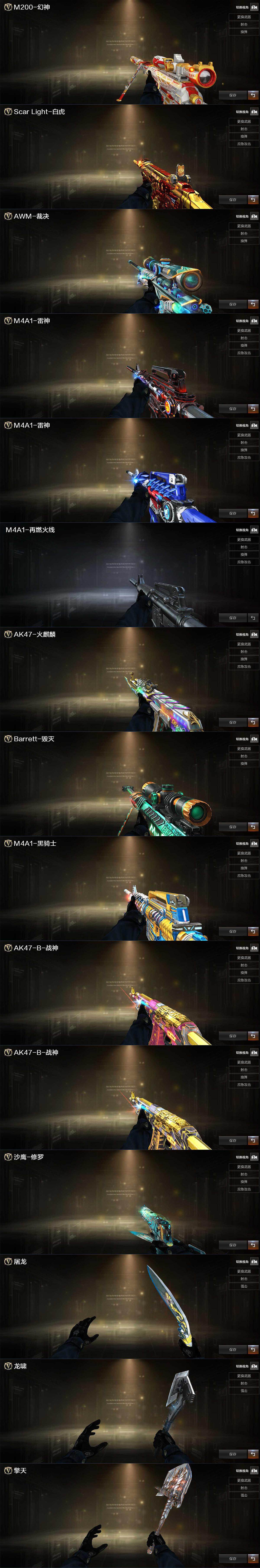【热门武器】:Scar Light-白虎,M200-竞技荣光,QBZ03-街机,M4A1-黑骑士,汤姆逊-烈龙*5,USP-雷暴,沙鹰-修罗*4