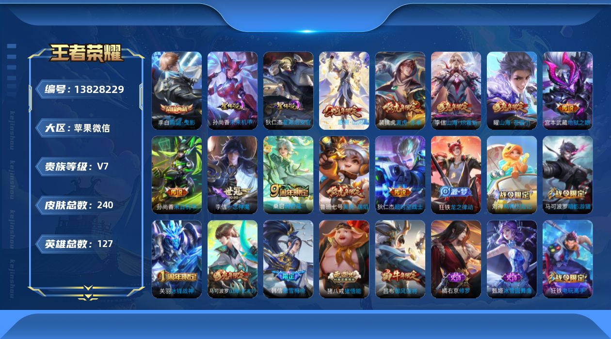 [13828229]苹果WX-V7-127英雄-240皮肤-2水+1小兵-10传说-75史诗-2星元 【英雄全皮】:李信全皮,猪八戒全皮,蒙恬全皮 【荣耀典藏】:李白鸣剑曳影 【传说皮肤】:司空震愿照山河定,桑启鸣野蒿,曜山海苍雷引,李信山海炽霜斩,裴擒虎寅虎赤拳,鲁班七号寅虎瑞焰,李信一念神魔,孙尚香末日机甲,宫本武藏地狱之眼,狄仁杰超时空战士 【限定皮肤】:狄仁杰阴阳师,廉颇寅虎御盾,赵云皇家上将,墨子神迹守卫,嬴政优雅恋人,孙尚香蔷薇恋人,鲁班七号寅虎瑞焰,高渐离死亡摇滚,钟无艳超时空战士,孙膑寅虎展翼,扁鹊奇幻香踪,白起夜都怪侠,芈月幻夜卜梦,吕布御风骁将,周瑜赤莲之焰,元歌无心,甄姬落雪兰心,马可波罗暗影游猎,马可波罗山海玄木吟,狄仁杰魔术师,狄仁杰万华元夜,达摩星际陆战队,达摩沙漠行僧,项羽海滩派对,老夫子醍醐杖,老夫子航海奇遇记,关羽冰锋战神,程咬金演武夺筹,韩信逐梦之影,韩信傲雪梅枪,王昭君午后时光,兰陵王金庭之子,亚瑟潮玩骑士王,李元芳云中旅人,钟馗驱傩正仪,杨玉环寅虎心曲,杨戬潮玩骑兵,雅典娜黎明之约,太乙真人华丽摇滚,鬼谷子原初探秘者,鬼谷子五谷丰年,黄忠火炮绅士,苏烈千军破阵,百里玄策原初追逐者,梦奇顽趣,沈梦溪大漠名商,明世隐疑决卦,明世隐吟游魔法,裴擒虎李小龙,裴擒虎寅虎赤拳,裴擒虎擒涛扼浪,狂铁电玩高手,米莱狄胡桃异想国,云中君纤云弄巧,李信山海炽霜斩,猪八戒西部大镖客,猪八戒猪悟能,上官婉儿梁祝,嫦娥拒霜思,嫦娥暖冬兔眠,曜山海苍雷引,鲁班大师探海日志,镜匿光追影者,桑启海盐诗旅,暃星界游侠,阿古朵江河有灵,张良古海寻踪,蒙恬荣光圣徽,鬼谷子天穹祈灯,沈梦溪龙舞盛年,刘邦剑破天穹,程咬金群星魔术团,周瑜熔金海岸 【年限皮肤】:裴擒虎寅虎赤拳,孙膑寅虎展翼,鲁班七号寅虎瑞焰,杨玉环寅虎心曲,廉颇寅虎御盾,吕布御风骁将,马可波罗山海玄木吟,李信山海炽霜斩,曜山海苍雷引 【赛季限定】:狄仁杰万华元夜,达摩沙漠行僧,老夫子醍醐杖,程咬金演武夺筹,兰陵王金庭之子,张良古海寻踪,李元芳云中旅人,钟馗驱傩正仪,雅典娜黎明之约,鬼谷子原初探秘者,苏烈千军破阵,百里玄策原初追逐者,梦奇顽趣,沈梦溪大漠名商,明世隐疑决卦,裴擒虎擒涛扼浪,鲁班大师探海日志,桑启海盐诗旅,鬼谷子天穹祈灯,蒙恬荣光圣徽,刘邦剑破天穹 【战令限定】:墨子神迹守卫,钟无艳超时空战士,扁鹊奇幻香踪,