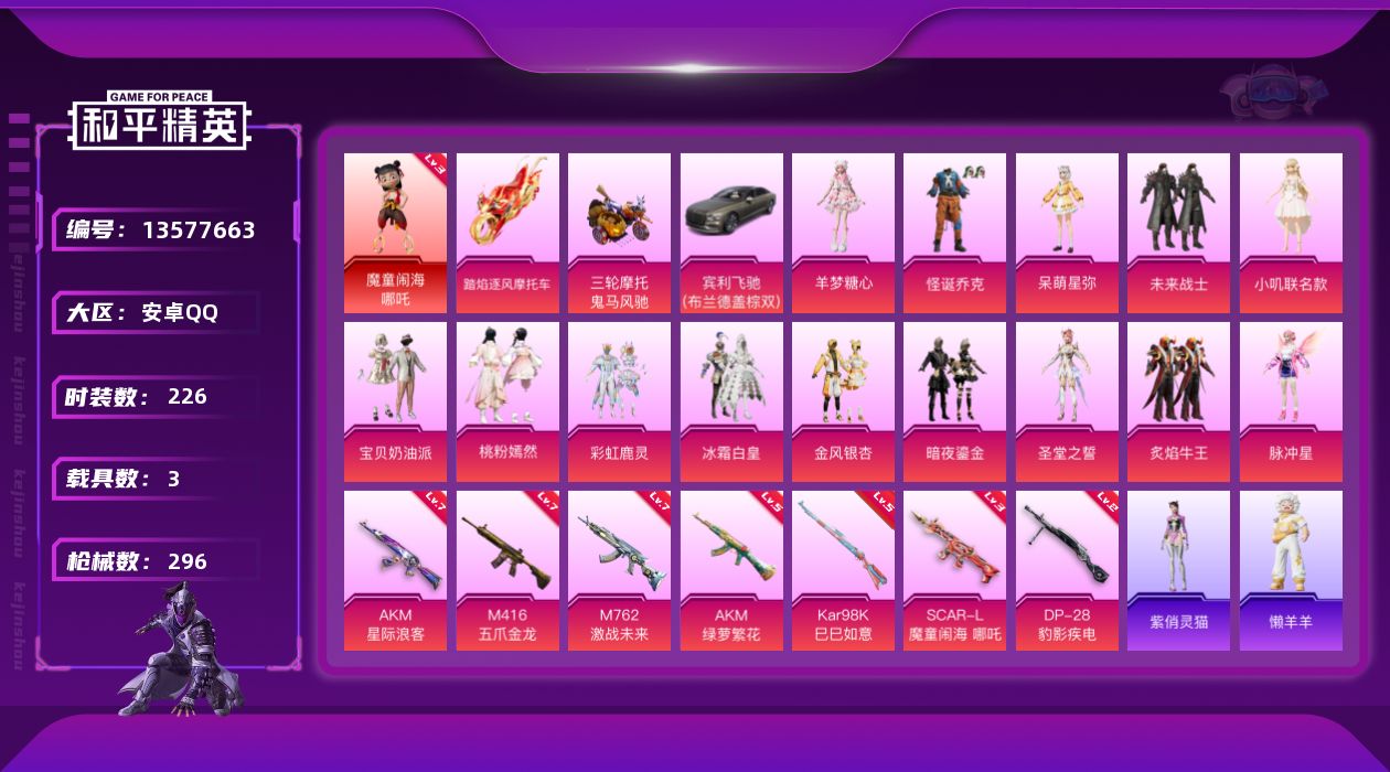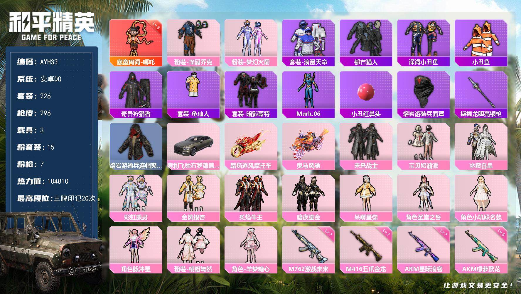 [13577663]【店主推荐捡漏号!可直接换绑】安卓 手Q-1神装-15粉装-7特效枪-3载具-8粉色飞行器-104810热力值-20王牌印记-226套装-296枪皮【红色神装等级】:魔童闹海-哪吒(三级)【红色角色神装】:魔童闹海-哪吒【热门品类】:粉装-怪诞乔克,粉装-梦幻火箭,套装-浪漫天命,套装-都市猎人,套装-深海小丑鱼,套装-小丑鱼,套装-奇异狩猎者,套装-龟仙人,套装-暗影哥特,角色-Mark.06,小丑红鼻头,熔岩游骑兵面罩,撬棍-龙胆亮银枪,熔岩游骑兵连帽夹克【粉色载具】:宾利飞驰(布罗德盖棕双色),踏焰逐风摩托车,鬼马风驰【粉色套装】:粉装-未来战士,粉装-怪诞乔克,粉装-宝贝奶油派,粉装-梦幻火箭,粉装-冰霜白皇,粉装-彩虹鹿灵,粉装-金风银杏,粉装-炙焰牛王,粉装-暗夜鎏金,角色-呆萌星弥,角色-圣堂之誓,角色-小叽联名款,角色-脉冲星,粉装-桃粉嫣然,角色-羊梦糖心【粉色枪皮等级】:AKM-星际浪客(七级),AKM-绿萝繁花(五级),SCAR-L-魔童闹海 哪吒(三级),M416-五爪金龙(七级),M762-激战未来(七级),Kar98K-巳巳如意(五级),DP-28-豹影疾电(二级)【粉色枪皮】:AKM-星际浪客,AKM-绿萝繁花,SCAR-L-魔童闹海 哪吒,M416-五爪金龙,M762-激战未来,Kar98K-巳巳如意,DP-28-豹影疾电【粉色飞行器】:庄周梦蝶飞行器,冷魅冰骑飞行器,星夜魔法师飞行翼,萌物绒绒飞行器,繁龙极客飞行器,镜域双华-灵镜之阶,飞天猪飞行器