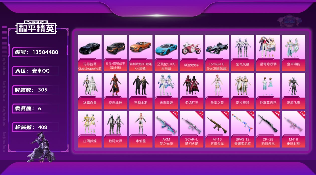 [13504480]可二次【店主推荐捡漏号!可直接换绑】素材身法号 安卓 手Q-16粉装-13特效枪-6载具-4粉色飞行器-13.4w热力值-19王牌印记-305套装-408枪皮【热门品类】:粉装-梦幻火箭,套装-浪漫天命,套装-小丑鱼,套装-奇异狩猎者,套装-龟仙人,套装-暗影哥特,套装-粉红小猪,套装-摄影小熊猫,套装-红红火火,角色-8号机,角色-Mark.06,小恶魔头饰【粉色载具】:玛莎拉蒂Quattroporte(夜幕蓝),乔治巴顿战车(鎏金黑),宾利欧陆GT敞篷(火焰橘),迈凯伦570S(天际蓝),Formula E Gen2(幽光蓝),极速兔兔车【粉色套装】:粉装-数码大师,粉装-梦幻火箭,粉装-潮汐统领,粉装-冰霜白皇,粉装-炙焰红王,粉装-飓风飞鹰,粉装-庄周梦蝶,粉装-紫电风暴,粉装-仲夏莫吉托,粉装-玉鳞金羽,粉装-炎氏战神,粉装-未来歌姬,角色-水仙星,角色-圣堂之誓,粉装-金丰海韵,粉装-星穹咏叹调【粉色枪皮等级】:AKM-梦之光华(七级),SCAR-L-梦幻火箭(七级),M416-五爪金龙(七级),M416-电玩时刻(五级),GROZA-镜光银凌(五级),AUG-超新星(五级),M762-青锋波束(五级),UMP45-量子极限(五级),Kar98K-未来歌姬(五级),Kar98K-巳巳如意(五级),M417-第五大道(四级),SPAS-12-音爆索尼克(六级),DP-28-豹影疾电(五级)【粉色飞行器】:梦之光华飞行器,天之羽翼飞行器,粉樱探戈飞行器