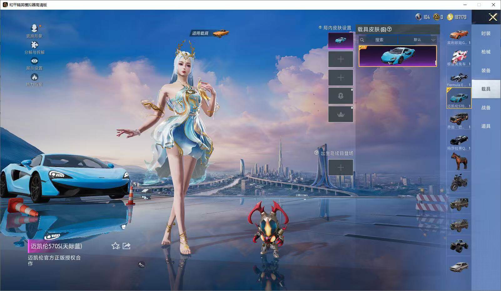 乔治·巴顿战车(鎏金黑),宾利欧陆GT敞篷(火焰橘),玛莎拉蒂Quattroporte(夜幕蓝),迈凯伦570S(天际蓝),极速兔兔车,Formula_E_Gen2(幽光蓝)