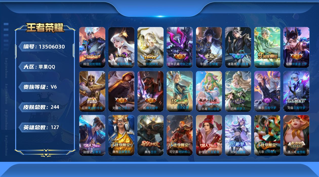 [13506030]苹果Q-V6-至尊星耀I段位-127英雄-244皮肤-1典藏-2星传说-10传说-86史诗