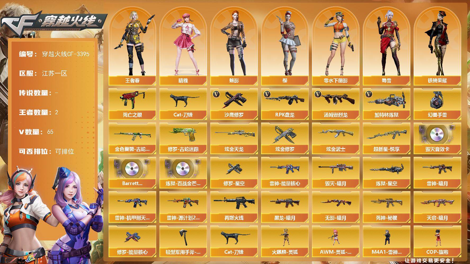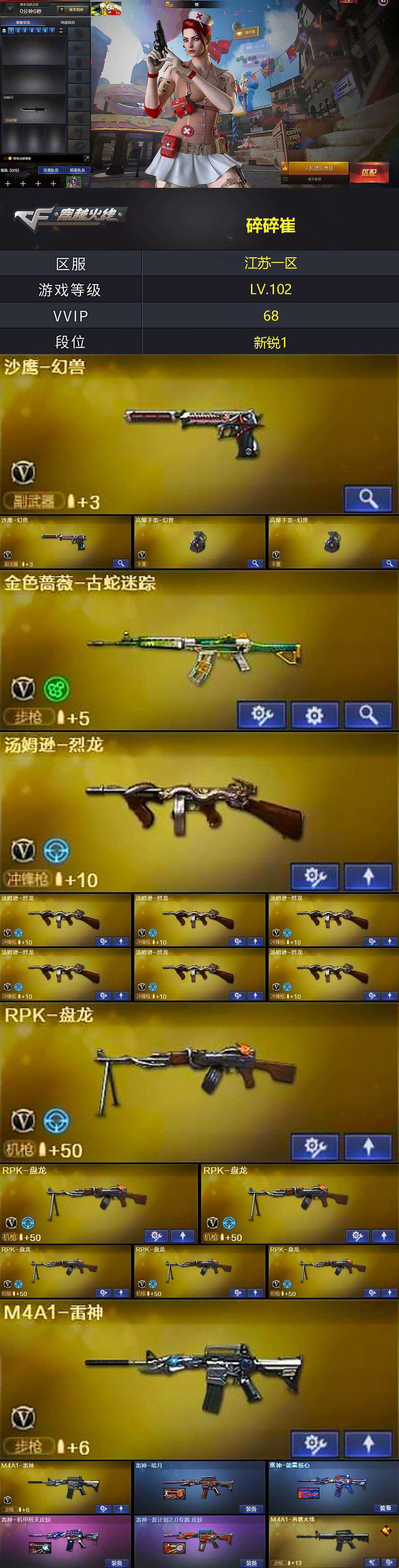 [13523270]江苏一区-65V-2王者-3炫金 【热门武器】:金色蔷薇-古蛇迷踪,修罗-古蛇迷踪,死亡之眼,Cat-刀锋,汤姆逊-烈龙*7,RPK-盘龙*6,加特林-炼狱*3,沙鹰-修罗*7,高爆手雷-幻兽*2 【王者炫金武器】:超新星-悦享,炫金武士,炫金天龙,炫金修罗 【音效卡】:Barrett-毁灭音效卡,Barrett-碧霄极光音效卡,炼狱-百战金芒-庆典舞曲音效卡 【皮肤】:雷神-暗月,雷神-能量核心,雷神-机甲刑天皮肤,雷神-源计划2.0专属 皮肤,M4A1-再燃火线,毁灭-暗月,黑龙-暗月,无影-暗月*3,死神-秘银,天启-暗月,炼狱-星空,修罗-能量核心,修罗-星空,轻型军用手斧-再燃火线 【角色】:樱,魅影,晴雅,战地猎狐,王者春,蛇隐宗,奇洋探员,北极狐-X,电竞少女,芳心审判者,虎妞,疾风,兰-新年限定,兰妹妹,猎狐者-追月,0号玩家,零-水下丽影,灵狐者-七夕宝贝,龙儿,龙儿-小淘气,蛇姬,斯沃特-X,蜀雪,铁骑荣耀,兔囡囡,樱-战斗天使,智影 【人偶武器】:火麒麟-灵狐,M4A1-雷神-精英刀锋,迷你钢铁终结者,迷你救赎猎手,加特林-机械猎手,AWM-灵狐-15周年嘉年华,COP-旗袍,Cat-刀锋,迷你生化手雷,生化手雷-机甲核心,巴雷特-赏金猎人*2 【暴走生化】:死亡之眼,超级对讲机 【挑战大师】:冰龙粉碎者-白马银枪,激光毁灭者III-白马银枪,激光毁灭者III 【英雄级武器】:AK47-火麒麟,M4A1-黑龙*3,M4A1-雷神*2,M4A1-死神,金色蔷薇-古蛇迷踪,M4A1-玫瑰精灵,M4A1-猎神,黑骑士-海王,Barrett-毁灭,Barrett-极光,RPK-盘龙*6,加特林-炼狱*3,炼狱-百战金芒,汤姆逊-烈龙*7,沙鹰-修罗*7,沙鹰-天神,沙鹰-幻兽*2,修罗-古蛇迷踪,屠龙*6,龙啸*2,擎天,麒麟刺,女皇利刃-幻兽,麒麟刺-百战金芒,高爆手雷-幻兽*2,高爆手雷-古蛇迷踪,闪光弹-幻兽*2,烟雾弹-幻兽*2,烟雾弹-古蛇迷踪,M4A1-赤狱骑士,AWM-昌龙,Barrett-碧霄极光 【道具】:CFS限定背包,云山科技背包,冰冰企鹅背包,古蛇迷踪炫彩背包,战舰背包,炫彩背包,百战金芒炫彩背包,超级背包*2,圣拳猎手-炽雪,地狱终结者-妲己,终极猎手-秦魂将军,女皇终结者-魔龙之吻,救世主-黑桃战神,绿色巨人,灵魂忍者*3