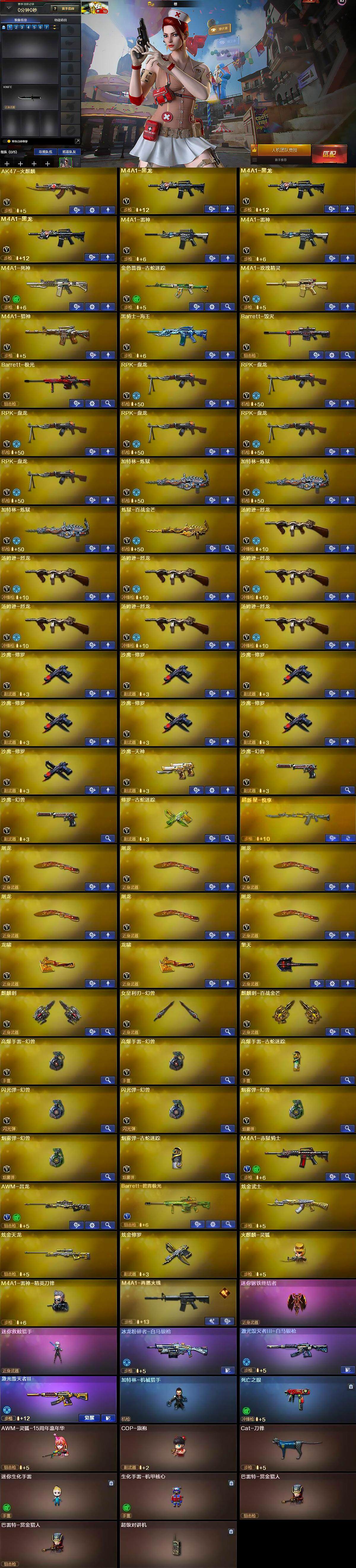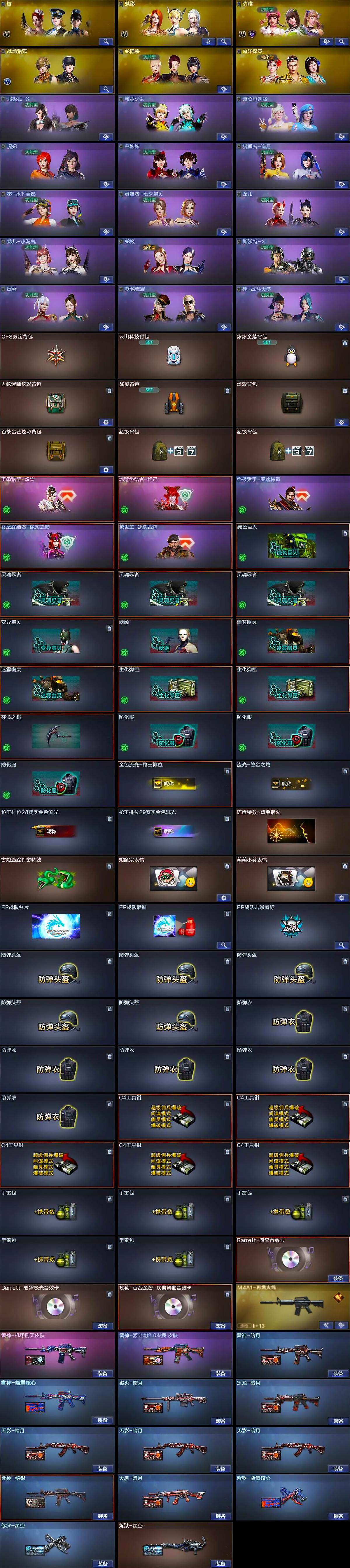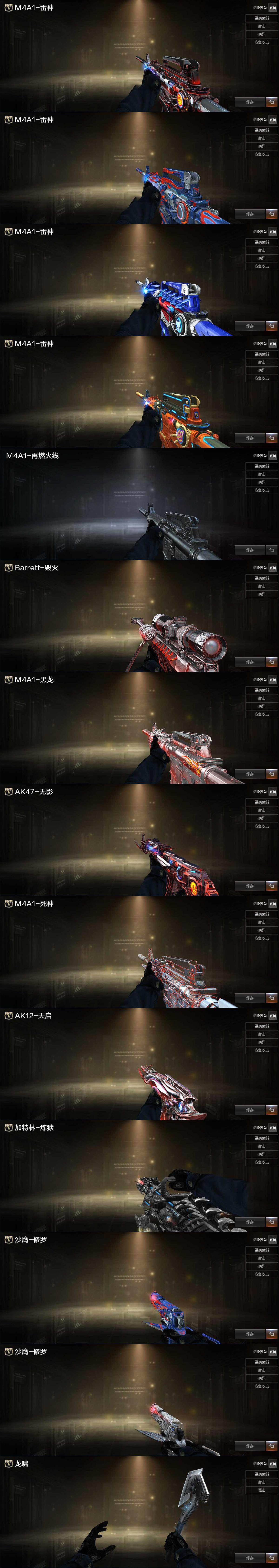 【英雄级武器】:AK47-火麒麟,M4A1-黑龙*3,M4A1-雷神*2,M4A1-死神,金色蔷薇-古蛇迷踪,M4A1-玫瑰精灵,M4A1-猎神,黑骑士-海王,Barrett-毁灭,Barrett-极光,RPK-盘龙*6,加特林-炼狱*3,炼狱-百战金芒,汤姆逊-烈龙*7,沙鹰-修罗*7,沙鹰-天神,沙鹰-幻兽*2,修罗-古蛇迷踪,屠龙*6,龙啸*2,擎天,麒麟刺,女皇利刃-幻兽,麒麟刺-百战金芒,高爆手雷-幻兽*2,高爆手雷-古蛇迷踪,闪光弹-幻兽*2,烟雾弹-幻兽*2,烟雾弹-古蛇迷踪,M4A1-赤狱骑士,AWM-昌龙,Barrett-碧霄极光