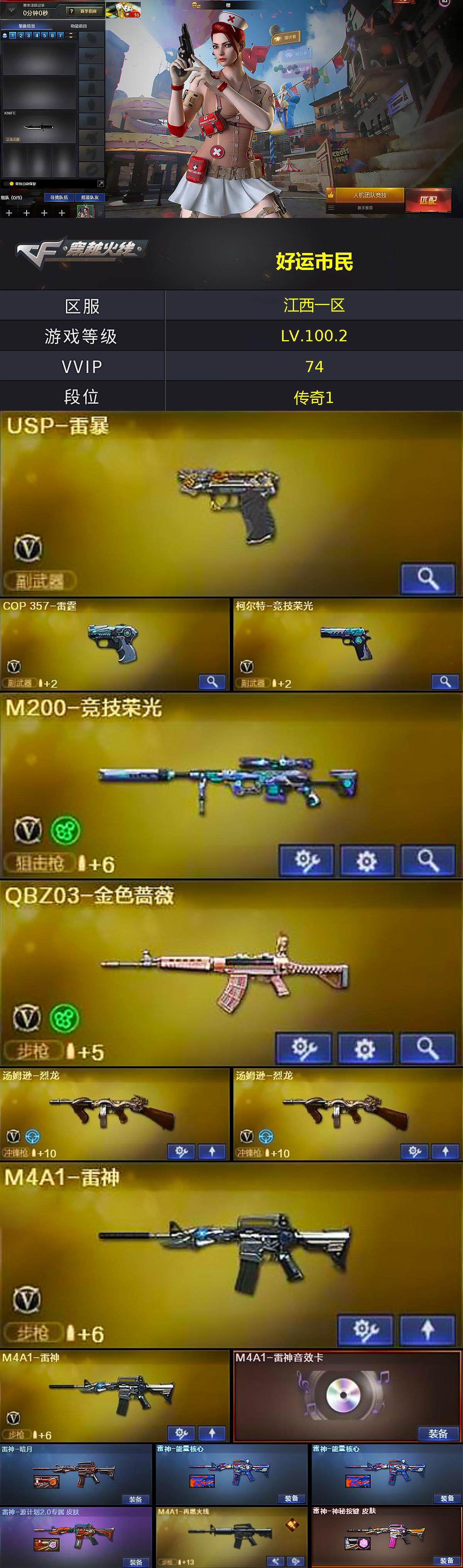 [13853839]江西一区-74V-5王者-1炫金 【热门武器】:QBZ03-金色蔷薇,M200-竞技荣光,死亡之眼,C.A.T,M4A1-黑骑士,汤姆逊-烈龙*2,加特林-炼狱,USP-雷暴,沙鹰-修罗*4,金刚伞 【王者炫金武器】:王者之势,王者之影,炫金黑龙 【音效卡】:M4A1-雷神音效卡,M4A1-黑骑士音效卡,Barrett-毁灭音效卡,炼狱-百战金芒-庆典舞曲音效卡 【皮肤】:雷神-暗月,雷神-能量核心*2,雷神-源计划2.0专属 皮肤,M4A1-再燃火线,雷神-神秘按键 皮肤,毁灭-暗月,毁灭-神秘黑洞皮肤,毁灭-虹光风暴 皮肤,黑骑士-暗月*4,黑骑士-电玩青兔皮肤,无影-暗月,无影-能量核心,死神-秘银*2,天启-暗月,天龙-秘银*3,天龙-能量核心,AWM-天龙-传奇白鲨,修罗-能量核心*2,天神-暗月*2,轻型军用手斧-再燃火线 【角色】:樱,炫,电竞教官-云悠悠,晴雅,暗夜-X,风暴女,嘉年华灵狐,娟娟,灵狐者-X,灵狐者-黄金海岸,曼陀罗-X,曼陀罗-礼服,萌儿,潘多拉-X,潘多拉-甜心教官,蜀雪,影武者-X 【人偶武器】:AWM-灵狐-15周年嘉年华*2,M37-葵,C.A.T,夺魂 【暴走生化】:死亡之眼 【挑战大师】:冰龙粉碎者-白马银枪 【英雄级武器】:M4A1-千变,AK47-火麒麟*2,M4A1-黑龙,M4A1-雷神*2,M4A1-黑骑士,AK47-无影,AK12-天启*2,AK47-黑鲨,M4A1-雷霆,无影-神兵利器,黑武士-锦绣游龙,M4A1-玫瑰精灵,QBZ03-金色蔷薇,王者之心-觉醒版,王者之势-觉醒版,AWM-天龙*2,Barrett-毁灭*2,M200-竞技荣光,Barrett-金色蔷薇,加特林-炼狱,炼狱-百战金芒,汤姆逊-烈龙*2,沙鹰-修罗*4,沙鹰-天神*2,USP-雷暴,雷霆之契,柯尔特-竞技荣光,屠龙*3,龙啸,麒麟刺,擎天-竞技荣光,麒麟刺-百战金芒,王者之锋-觉醒版,高爆手雷-雷霆*7,高爆手雷-竞技荣光,闪光弹-雷霆*7,闪光弹-竞技荣光,烟雾弹-雷霆*7,烟雾弹-竞技荣光 【道具】:亚洲杯纪念炫彩背包,冰冰企鹅背包-猛男专用,战舰背包,炫彩背包,百战金芒炫彩背包,虎牙炫彩背包,超级背包,女皇终结者-魔龙之吻,绿色巨人,灵魂忍者*2,变异宝贝,迷雾幽灵*2,夺命之镰,防化服*2,金色流光-枪王排位*2,星辰流