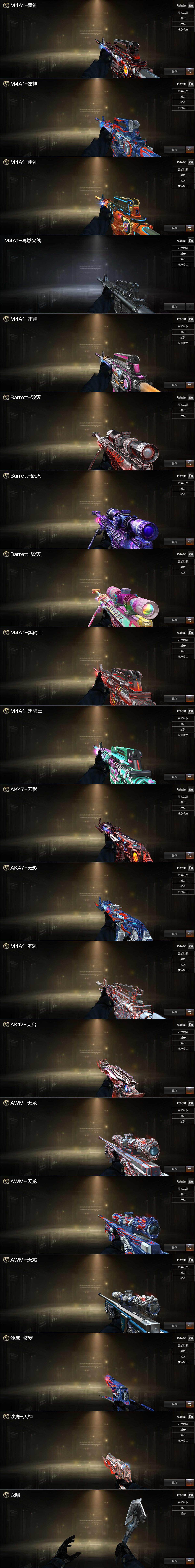 【英雄级武器】:M4A1-千变,AK47-火麒麟*2,M4A1-黑龙,M4A1-雷神*2,M4A1-黑骑士,AK47-无影,AK12-天启*2,AK47-黑鲨,M4A1-雷霆,无影-神兵利器,黑武士-锦绣游龙,M4A1-玫瑰精灵,QBZ03-金色蔷薇,王者之心-觉醒版,王者之势-觉醒版,AWM-天龙*2,Barrett-毁灭*2,M200-竞技荣光,Barrett-金色蔷薇,加特林-炼狱,炼狱-百战金芒,汤姆逊-烈龙*2,沙鹰-修罗*4,沙鹰-天神*2,USP-雷暴,雷霆之契,柯尔特-竞技荣光,屠龙*3,龙啸,麒麟刺,擎天-竞技荣光,麒麟刺-百战金芒,王者之锋-觉醒版,高爆手雷-雷霆*7,高爆手雷-竞技荣光,闪光弹-雷霆*7,闪光弹-竞技荣光,烟雾弹-雷霆*7,烟雾弹-竞技荣光