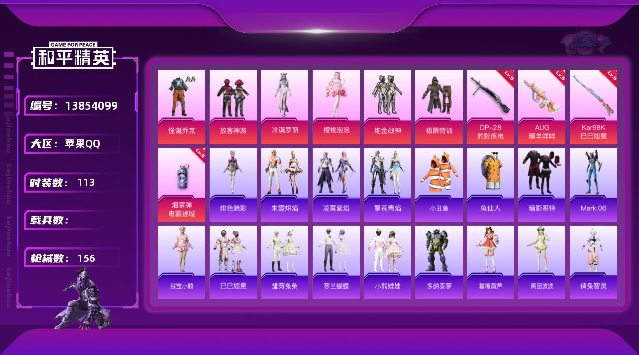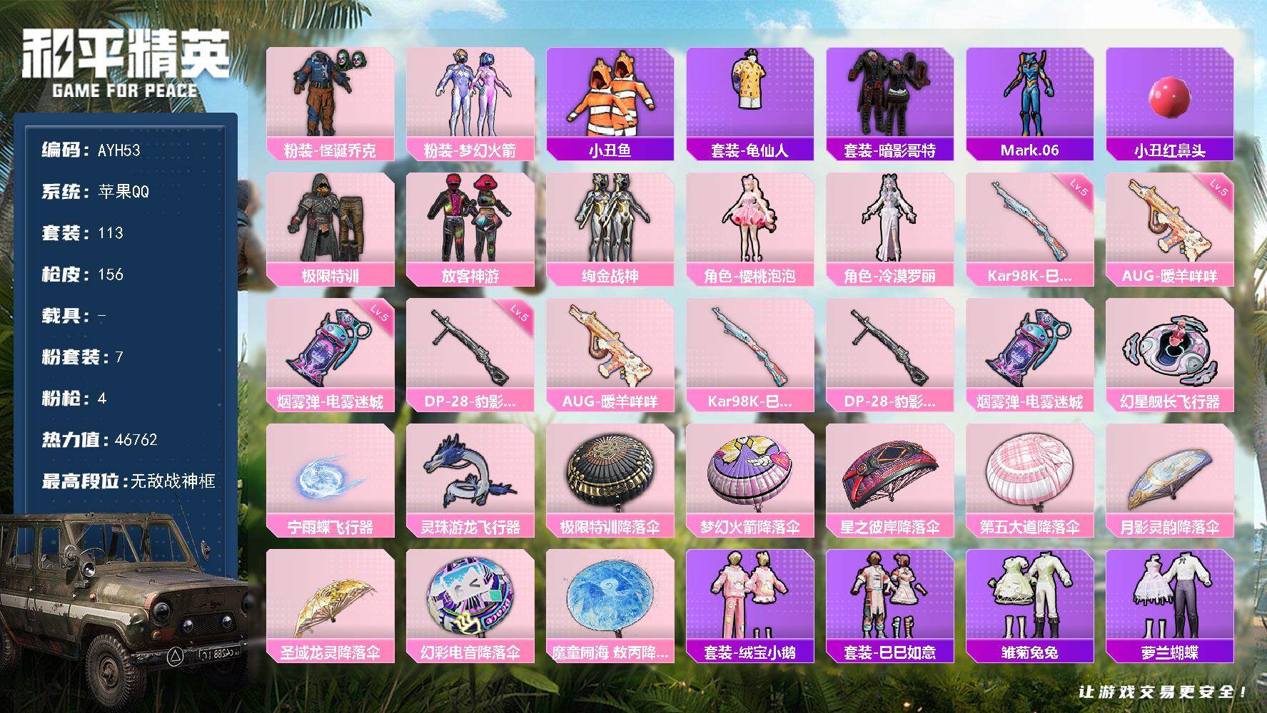 [13854099]可二次【店主推荐捡漏号!可直接换绑】苹果 手Q-无敌战神框-7粉装-4特效枪-0载具-4粉色飞行器-46762热力值-10王牌印记-113套装-156枪皮【热门品类】:粉装-怪诞乔克,粉装-梦幻火箭,套装-小丑鱼,套装-龟仙人,套装-暗影哥特,角色-Mark.06,小丑红鼻头【粉色套装】:粉装-极限特训,粉装-怪诞乔克,粉装-梦幻火箭,粉装-放客神游,粉装-绚金战神,角色-樱桃泡泡,角色-冷漠罗丽【粉色枪皮等级】:AUG-暖羊咩咩(五级),Kar98K-巳巳如意(五级),DP-28-豹影疾电(五级),烟雾弹-电雾迷城(五级)【粉色枪皮】:AUG-暖羊咩咩,Kar98K-巳巳如意,DP-28-豹影疾电,烟雾弹-电雾迷城【粉色飞行器】:幻星舰长飞行器,宁雨蝶飞行器,灵珠游龙飞行器
