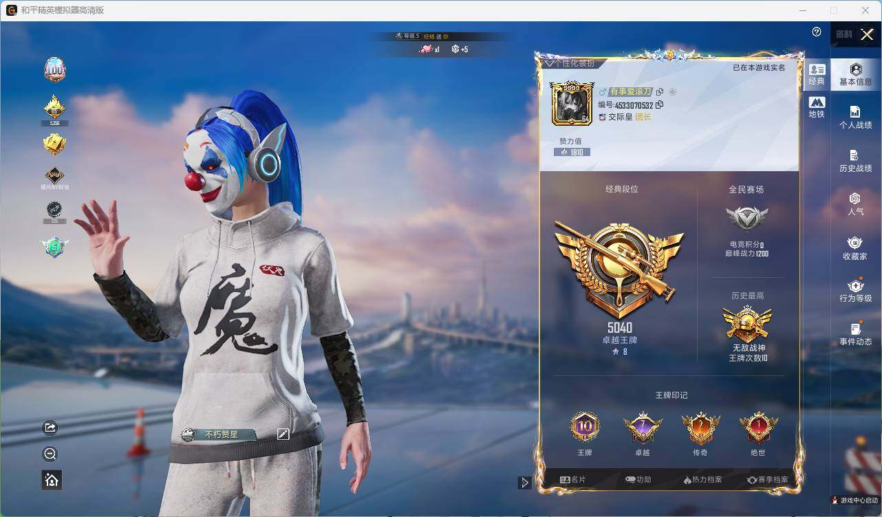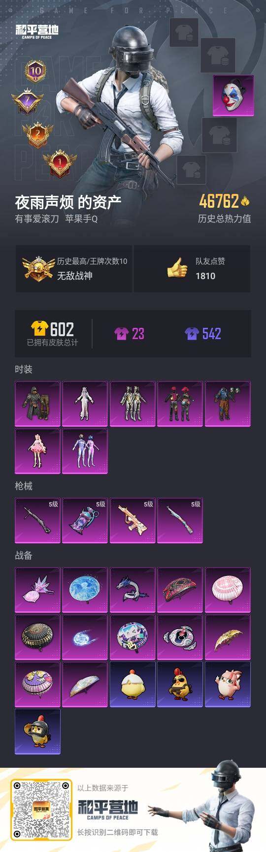 - [11860803]实名: 可修改 时装数: 254 枪械数: 98 战备数: 69 热门装扮: 莲影清波,烟云彩露 稀有枪皮: M416风花雪月,PKM江南烟雨,Kar98K-巳巳如意,DP-28-豹影疾电