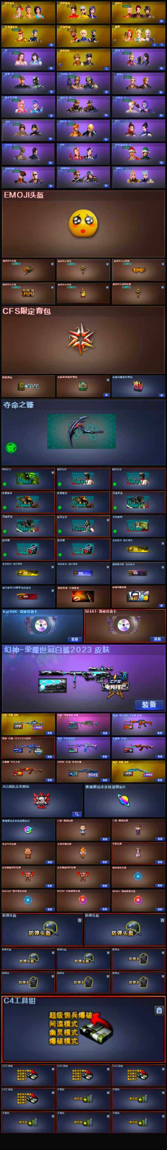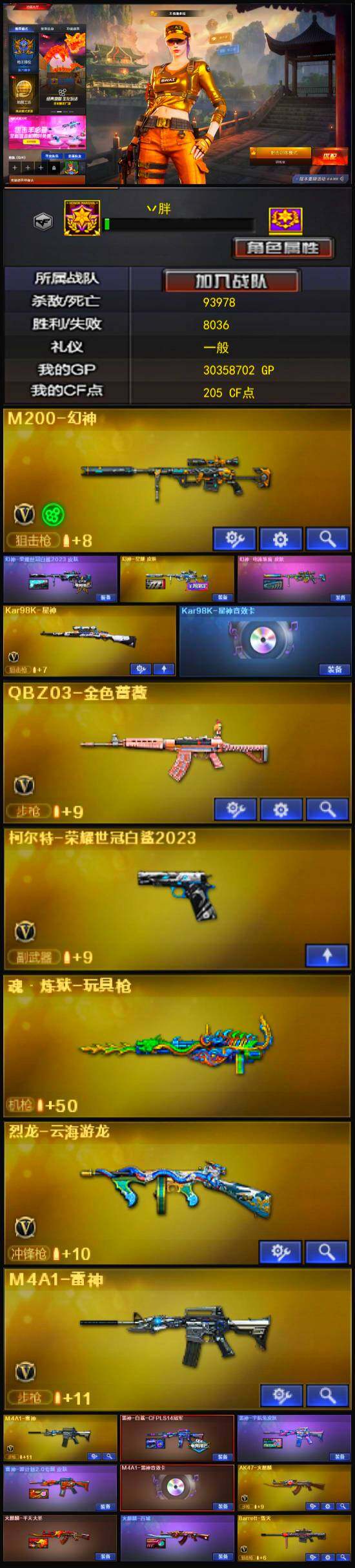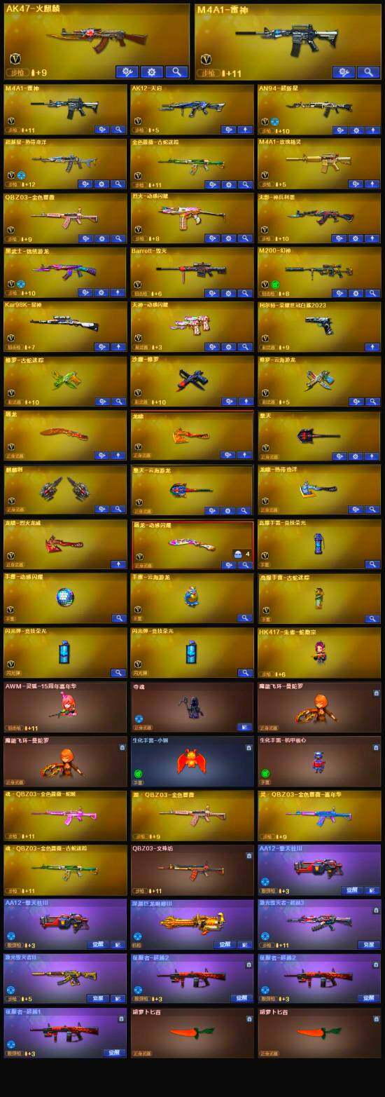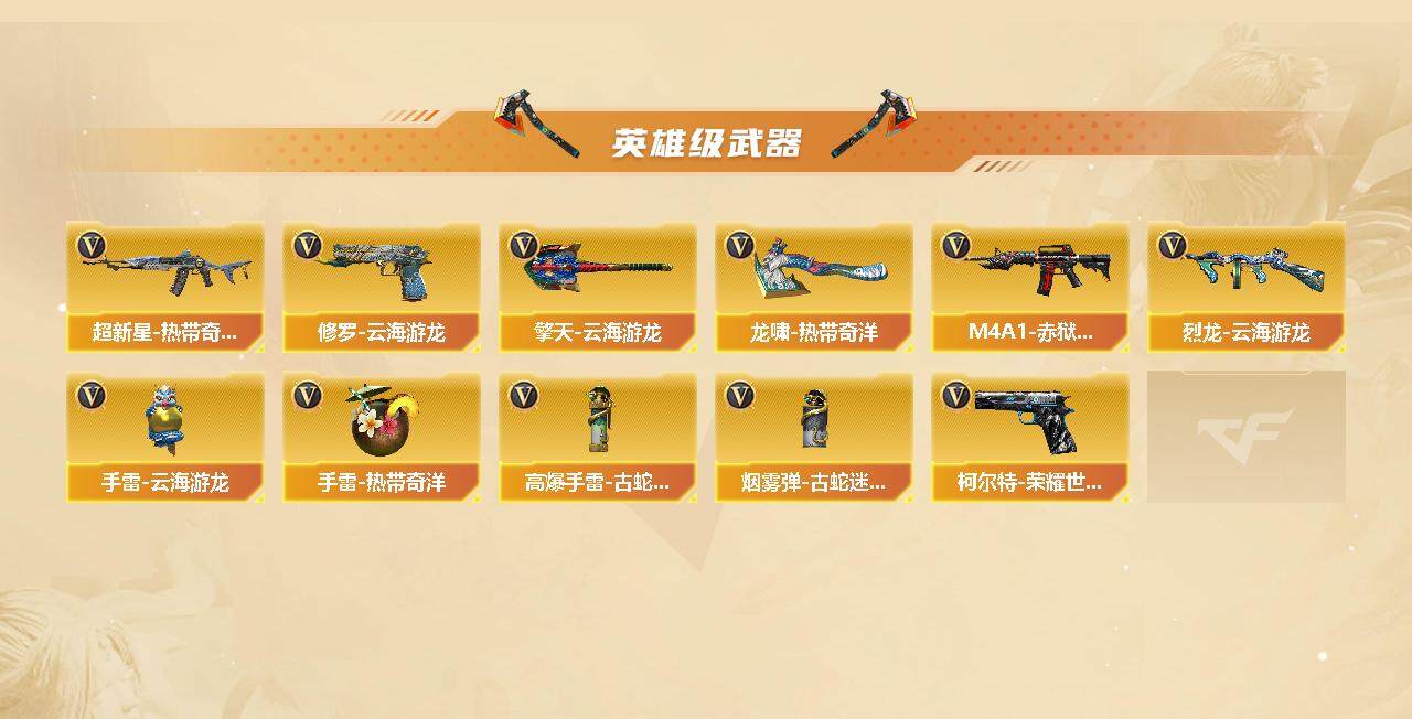 【英雄级武器】:AK47-火麒麟,M4A1-雷神*2,AK12-天启,AN94-超新星,无影-神兵利器,黑武士-锦绣游龙,超新星-热带奇洋,金色蔷薇-古蛇迷踪,M4A1-玫瑰精灵,QBZ03-金色蔷薇,烈火-动感闪耀,Barrett-毁灭,M200-幻神,Kar98K-星神,烈龙-云海游龙,沙鹰-修罗,柯尔特-荣耀世冠白鲨2023,天神-动感闪耀,修罗-云海游龙,修罗-古蛇迷踪,屠龙,龙啸,擎天,麒麟刺,屠龙-动感闪耀,擎天-云海游龙,龙啸-热带奇洋,高爆手雷-竞技荣光,手雷-动感闪耀,手雷-云海游龙,手雷-热带奇洋,高爆手雷-古蛇迷踪,闪光弹-竞技荣光*2,烟雾弹-古蛇迷踪,M4A1-赤狱骑士