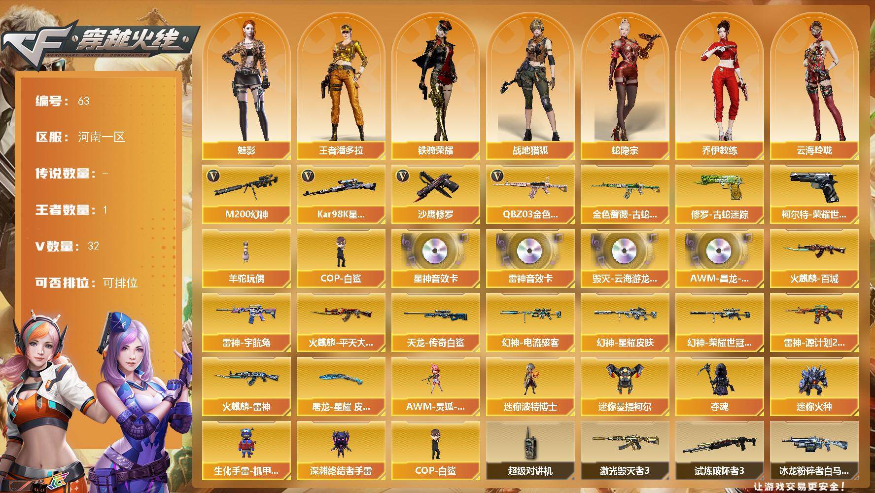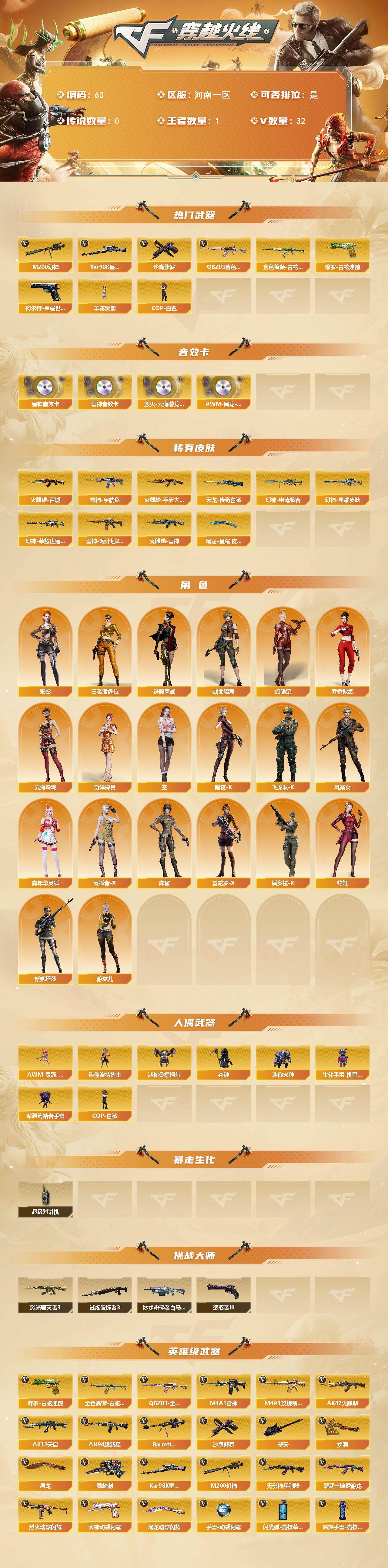 [13659493]河南一区-32V-1王者-0炫金 【热门武器】:QBZ03-金色蔷薇,M200-幻神,柯尔特-荣耀世冠白鲨2023,金色蔷薇-古蛇迷踪,修罗-古蛇迷踪,Kar98K-星神,羊驼玩偶,COP-白鲨*2,沙鹰-修罗 【音效卡】:M4A1-雷神音效卡,Barrett-毁灭-云海游龙音效卡,Kar98K-星神音效卡,AWM-昌龙-怀旧音效卡 【皮肤】:幻神-星耀 皮肤,幻神-电流骇客 皮肤,幻神-荣耀世冠白鲨2023 皮肤,雷神-宇航兔皮肤,雷神-源计划2.0专属 皮肤,火麒麟-雷神,火麒麟-平天大圣,火麒麟-百城,AWM-天龙-传奇白鲨,屠龙-星耀 皮肤 【角色】:魅影,战地猎狐,王者潘多拉,蛇隐宗,奇洋探员,乔伊教练,云海玲珑,空,暗夜-X,飞虎队-X,风暴女,嘉年华灵狐,灵狐者-X,麻雀,曼陀罗-X,潘多拉-X,蛇姬,铁骑荣耀,新娜塔莎,游珑儿 【人偶武器】:COP-白鲨*2,AWM-灵狐-15周年嘉年华,迷你波特博士,迷你曼提柯尔,夺魂,迷你火种,生化手雷-机甲核心,深渊终结者手雷 【暴走生化】:超级对讲机 【挑战大师】:冰龙粉碎者-白马银枪,激光毁灭者III,试炼破坏者III,惩戒者III 【英雄级武器】:AK47-火麒麟,M4A1-雷神*2,AK12-天启,AN94-超新星,无影-神兵利器,黑武士-锦绣游龙,超新星-热带奇洋,金色蔷薇-古蛇迷踪,M4A1-玫瑰精灵,QBZ03-金色蔷薇,烈火-动感闪耀,Barrett-毁灭,M200-幻神,Kar98K-星神,烈龙-云海游龙,沙鹰-修罗,柯尔特-荣耀世冠白鲨2023,天神-动感闪耀,修罗-云海游龙,修罗-古蛇迷踪,屠龙,龙啸,擎天,麒麟刺,屠龙-动感闪耀,擎天-云海游龙,龙啸-热带奇洋,高爆手雷-竞技荣光,手雷-动感闪耀,手雷-云海游龙,手雷-热带奇洋,高爆手雷-古蛇迷踪,闪光弹-竞技荣光*2,烟雾弹-古蛇迷踪,M4A1-赤狱骑士 【道具】:CFS限定背包,云海游龙炫彩背包,亚洲杯纪念炫彩背包,古蛇迷踪炫彩背包,奇洋探员-海龟背包,战舰背包,次元之矛-黄金背包,热带奇洋炫彩背包,超级背包,黑桃战神背包,女皇终结者-魔龙之吻,救世主-黑桃战神,绿色巨人,灵魂忍者*2,变异宝贝,迷雾幽灵*2,生化弹匣,夺命之镰,防化服*2,金色流光-枪王排位*2,星辰流光-枪王排位,巅峰赛先锋-金色流光,流光-再燃火线,枪王排位2
