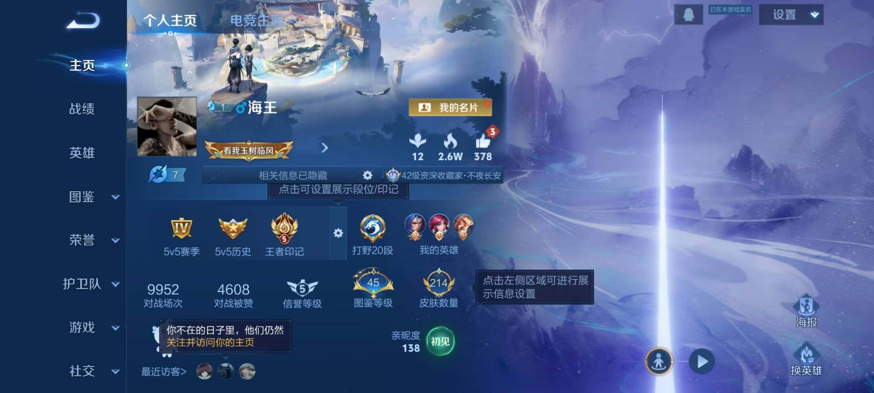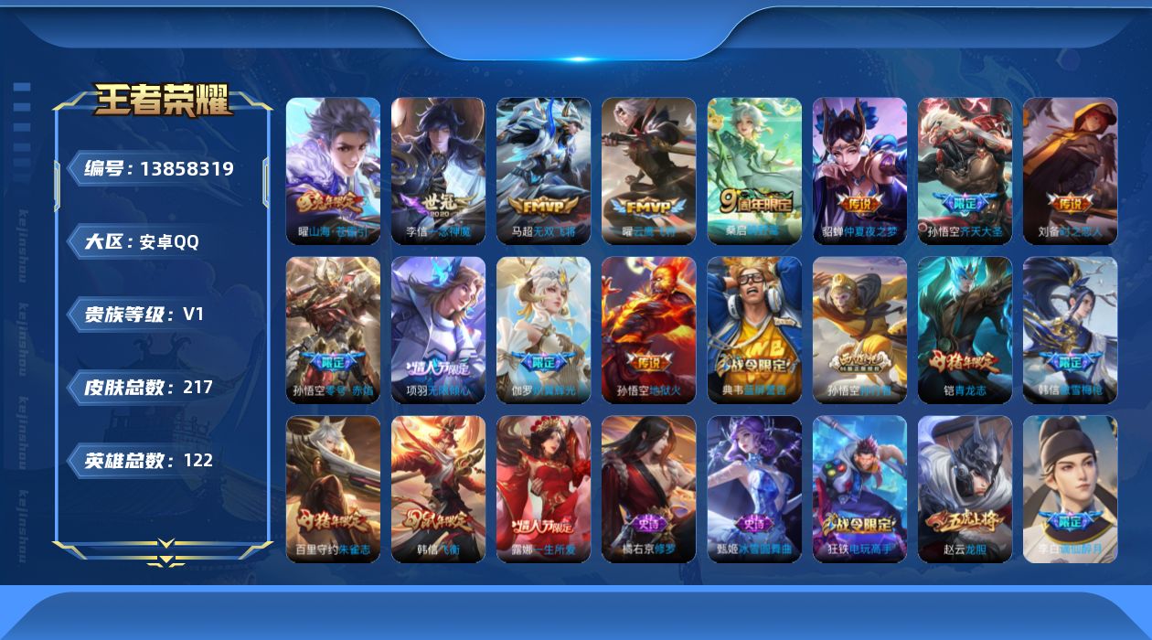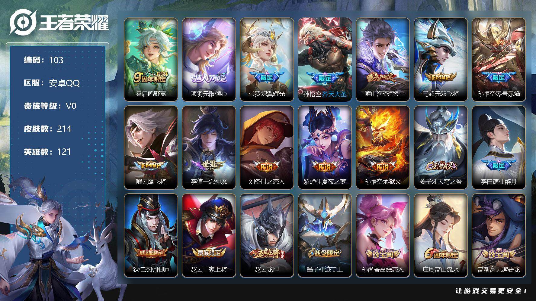 [13858319]安卓Q-V0-永恒钻石V段位-121英雄-214皮肤-0典藏-0珍品无双-0无双-0珍品传说-12传说-52史诗
