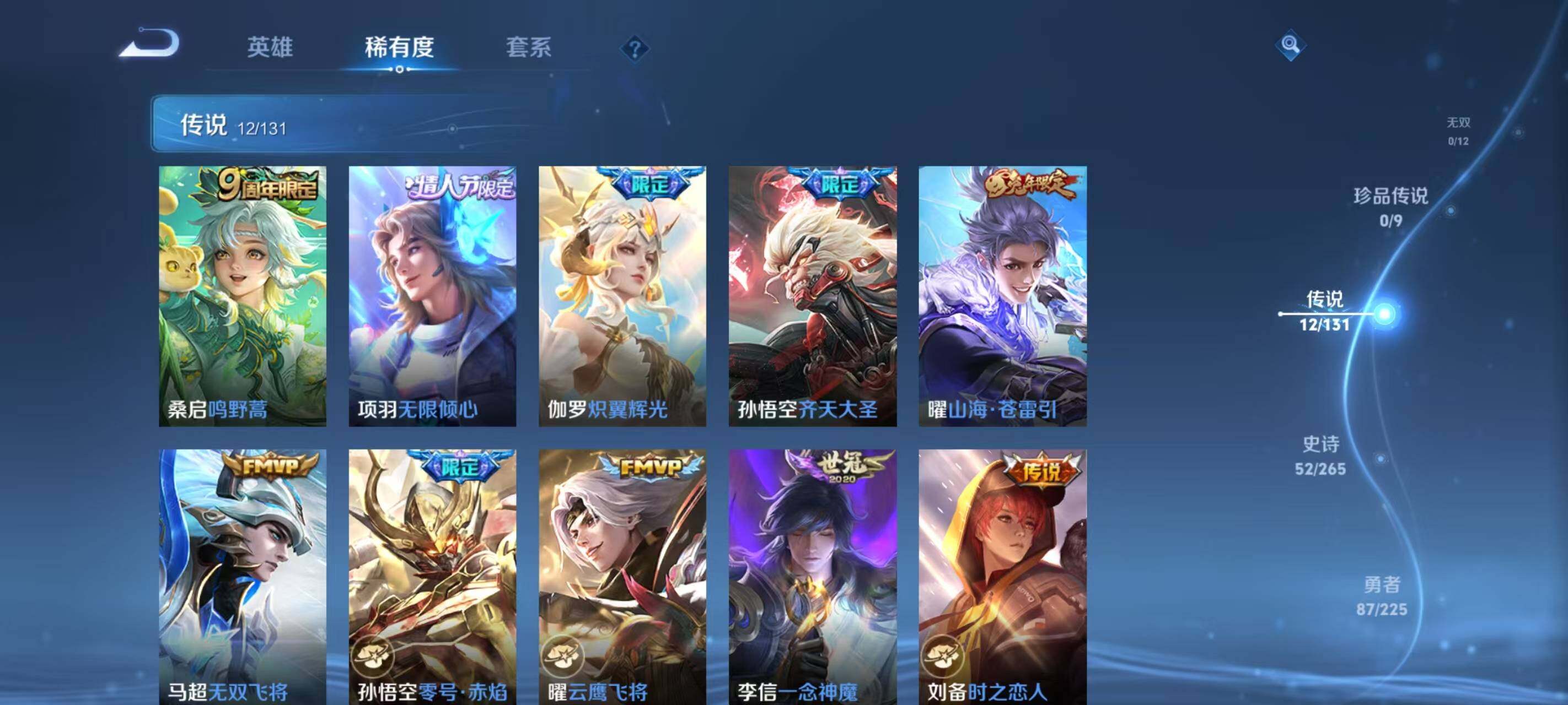 【传说皮肤】:桑启鸣野蒿,项羽无限倾心,伽罗炽翼辉光,孙悟空齐天大圣,曜山海苍雷引,马超无双飞将,孙悟空零号赤焰,曜云鹰飞将,李信一念神魔,刘备时之恋人,貂蝉仲夏夜之梦,孙悟空地狱火