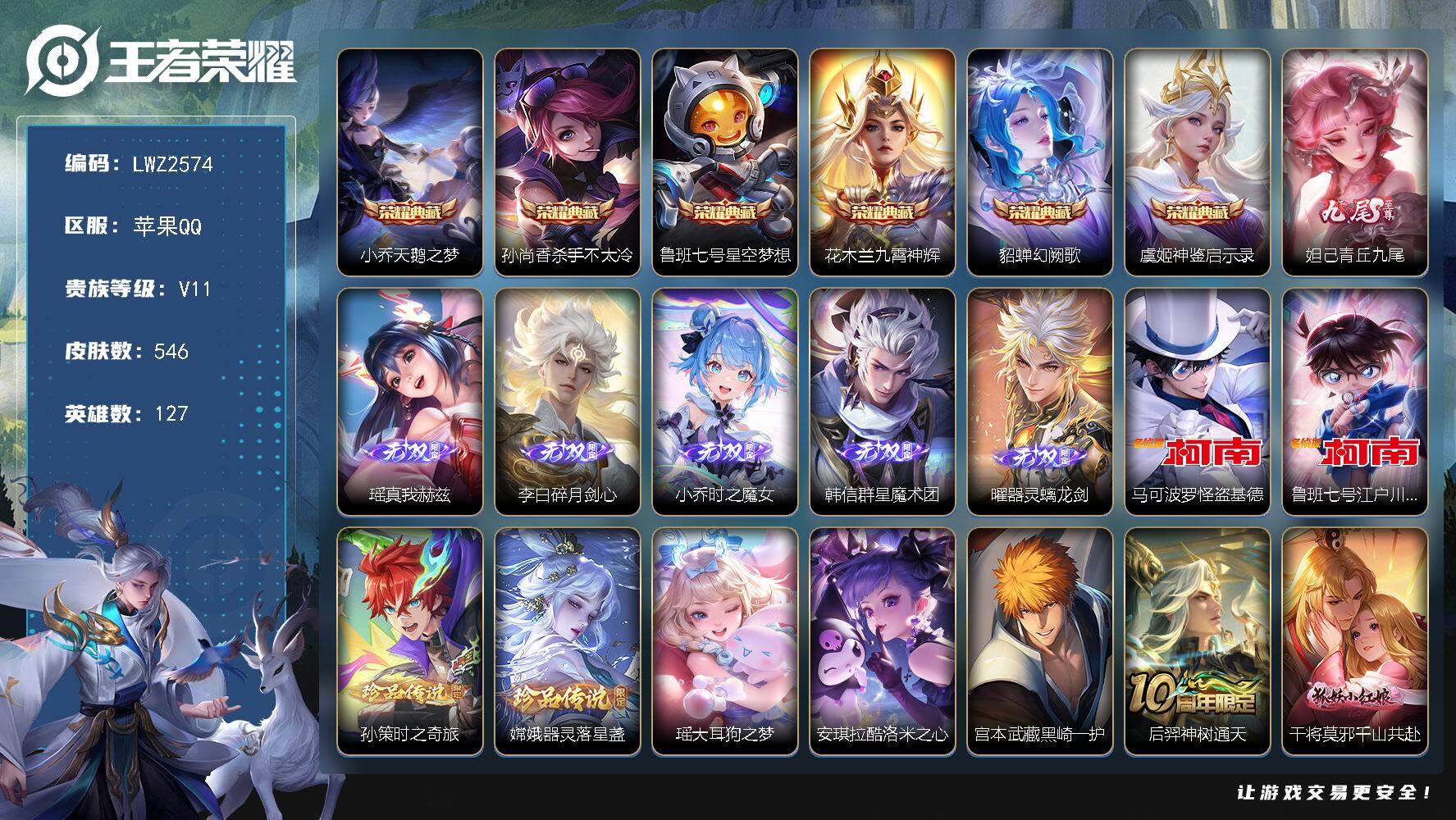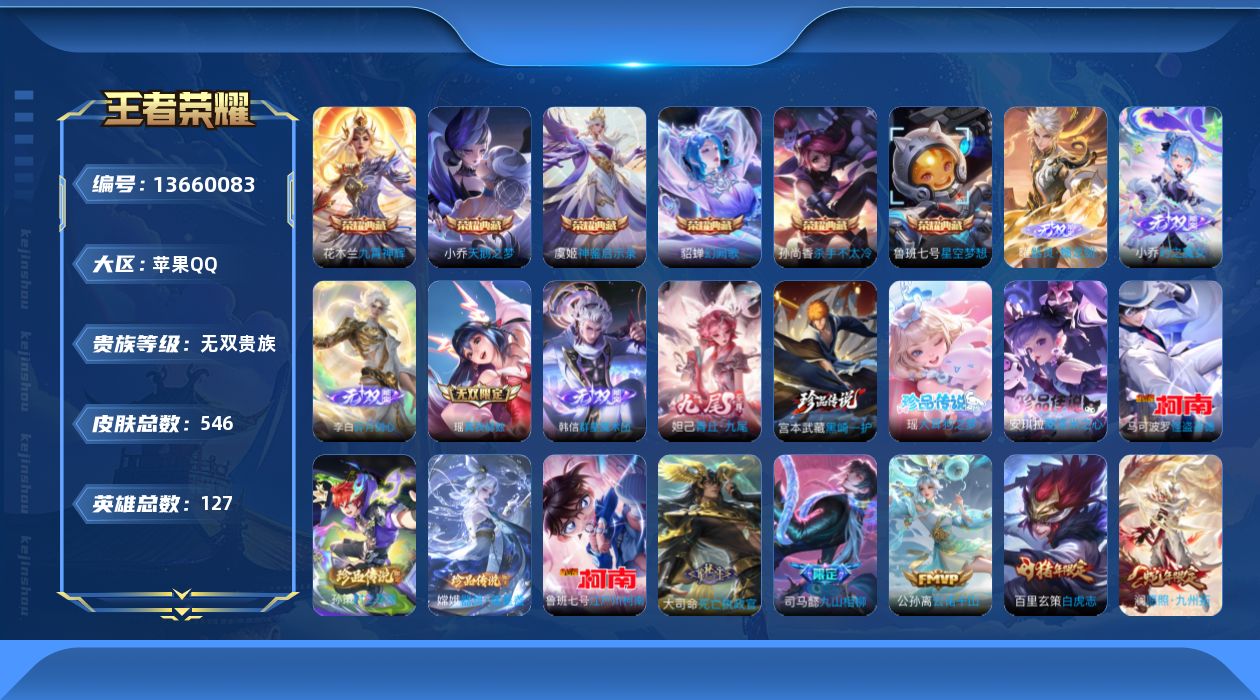 [13660083]苹果Q-V11-最强王者段位-127英雄-546皮肤-6典藏-6无双-7珍品传说-77传说-179史诗 【英雄全皮】:小乔全皮,鲁班七号全皮,刘禅全皮,安琪拉全皮,孙权全皮,朵莉亚全皮,虞姬全皮,苍全皮,鬼谷子全皮,狂铁全皮,大司命全皮,西施全皮,蒙恬全皮,司空震全皮,戈娅全皮,空空儿全皮,影全皮,海诺全皮,少司缘全皮 【荣耀典藏】:小乔天鹅之梦,孙尚香杀手不太冷,鲁班七号星空梦想,花木兰九霄神辉,貂蝉幻阙歌,虞姬神鉴启示录 【无双皮肤】:妲己青丘九尾,瑶真我赫兹,李白碎月剑心,小乔时之魔女,韩信群星魔术团,曜器灵螭龙剑 【珍品传说】:马可波罗怪盗基德,鲁班七号江户川柯南,孙策时之奇旅,嫦娥器灵落星盏,瑶大耳狗之梦,安琪拉酷洛米之心,宫本武藏黑崎一护 【传说皮肤】:后羿神树通天,干将莫邪千山共赴,大司命死亡执政官,司马懿九山相柳,公孙离云诺千山,西施续相思,杨玉环星之鸣奏,后羿千劫归真,司空震愿照山河定,女娲愿照千秋盛,妲己愿照众生和,澜愿照九州拓,蔡文姬愿照福禄聚,虞姬愿照岁时盈,云缨幻光神枪,裴擒虎祥瑞亨通,王昭君映山客,桑启鸣野蒿,朵莉亚心动手记,吕布曦玄引,貂蝉曦玄引,典韦战鼓燎原,孙尚香乘龙问璇玑,孙策乘龙淬吴钩,赵云乘龙铭钟鼎,马超琥珀纪元,铠琥珀纪元,澜逐花归海,艾琳觅芳踪,露娜霜月吟,王昭君永恒水手月亮,甄姬至美化雀舞,鲁班七号时之奇旅,兰陵王影龙天霄,上官婉儿妄想奇谈,马可波罗妄想实况,东皇太一灼幽烈阳,诸葛亮鹤羽星尊,亚瑟追逃游戏,安琪拉追逃游戏,公孙离记忆之芯,夏洛特浮生妄,花木兰燃星之曲,虞姬无限倾心,项羽无限倾心,伽罗炽翼辉光,孙悟空齐天大圣,小乔山海琳琅生,李信山海炽霜斩,不知火舞绯月行,百里守约碎云,孙尚香音你闪耀,大乔挚爱花嫁,孙策挚爱之约,女娲补天,瑶时之祈愿,鲁班七号寅虎瑞焰,王昭君乞巧织情,西施游龙清影,周瑜音你心动,小乔音你心动,兰陵王默契交锋,诸葛亮时雨天司,镜炽阳神光,虞姬启明星使,曜云鹰飞将,伽罗太华,貂蝉猫影幻舞,干将莫邪久胜战神,虞姬云霓雀翎,百里玄策白虎志,花木兰冠军飞将,后羿黄金射手座,诸葛亮武陵仙君,貂蝉仲夏夜之梦,孙尚香末日机甲,狄仁杰超时空战士 【限定皮肤】:白起狰,暃埋骨钱,蔡文姬夏日便利店,大乔绒语心约,虞姬夏日便利店,姜子牙天穹之誓,杨戬破阵退雄兵,狄仁杰阴阳师,小乔纯白花嫁,虞姬凯尔特女王,小乔山