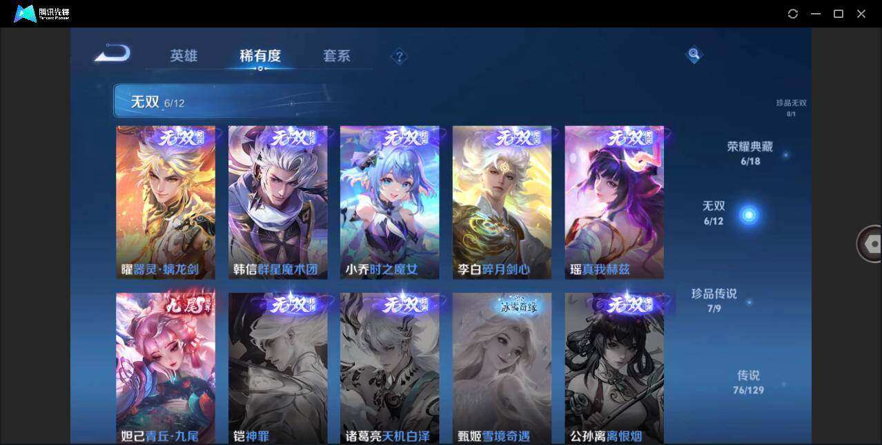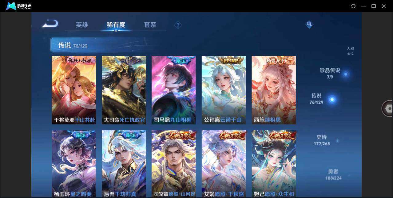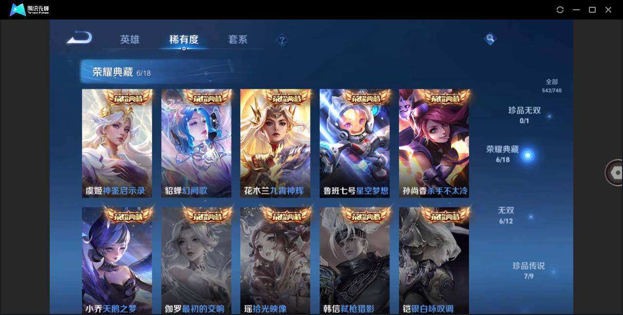 - PX_2085578-93 安卓QQ/最强王者/264皮肤/124英雄/2典藏/0珍品无双/1无双/1珍品传说/15传说/72史诗/8稀有英雄 【1 珍品传说】怪盗基德 马可波罗, 【2 典藏皮肤】杀手不太冷 孙尚香,拾光映像 瑶, 【1 无双皮肤】真我赫兹 瑶, 【15 传说皮肤】启明星使 虞姬,云鹰飞将 曜,游龙清影 西施,猫影幻舞 貂蝉,仲夏夜之梦 貂蝉,时雨天司 诸葛亮,黄金射手座 后羿,
