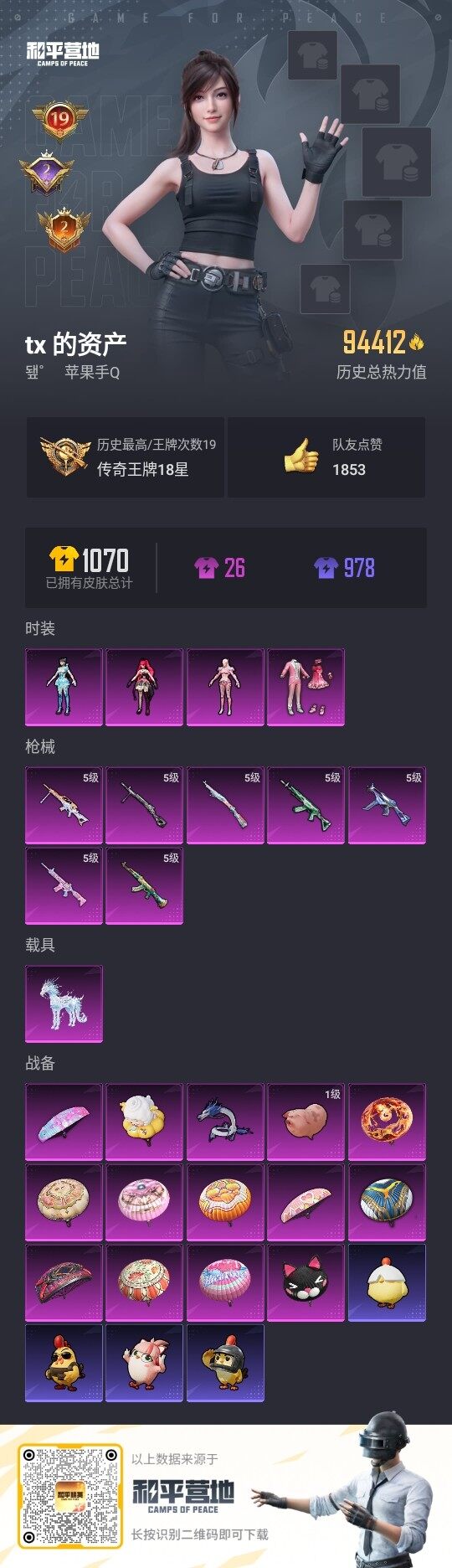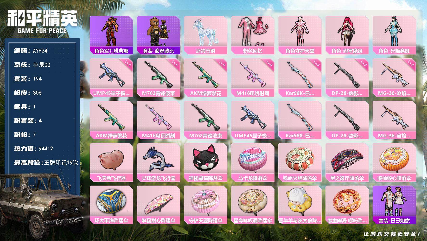 [13566870]可二次【店主推荐捡漏号!可直接换绑】苹果 手Q-4粉装-7特效枪-1载具-2粉色飞行器-94412热力值-19王牌印记-194套装-306枪皮【热门品类】:角色-军刀雅典娜,套装-浪漫波比【粉色载具】:冰绡玉鳞【粉色套装】:粉装-粉色回忆,角色-守护天翼,角色-绯穹魔姬,角色-异瞳寒姬【粉色枪皮等级】:AKM-绿萝繁花(五级),M416-电玩时刻(五级),M762-青锋波束(五级),UMP45-量子极限(五级),Kar98K-巳巳如意(五级),DP-28-豹影疾电(五级),MG-36-沧焰双生(五级)【粉色枪皮】:AKM-绿萝繁花,M416-电玩时刻,M762-青锋波束,UMP45-量子极限,Kar98K-巳巳如意,DP-28-豹影疾电,MG-36-沧焰双生【粉色飞行器】:飞天猪飞行器,灵珠游龙飞行器