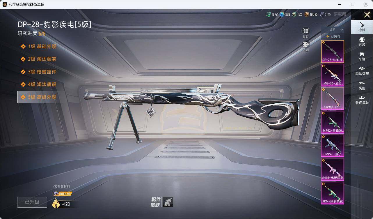 AKM-绿萝繁花,M416-电玩时刻,M762-青锋波束,UMP45-量子极限,Kar98K-巳巳如意