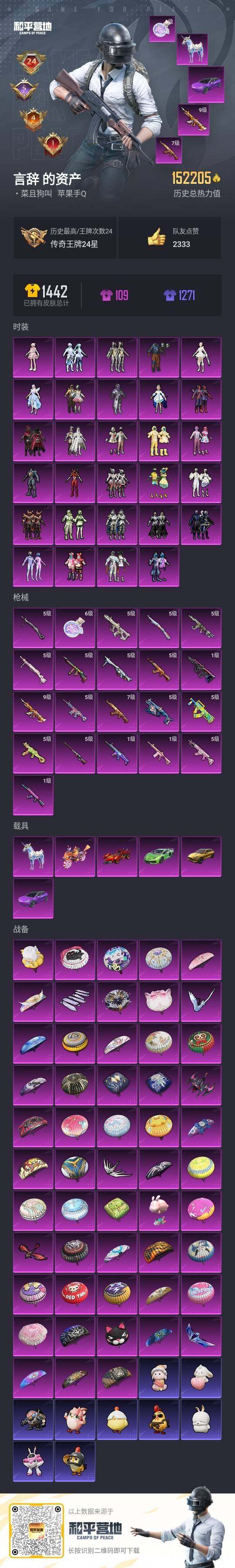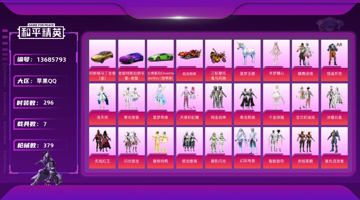 - [11969562]1粉装 6特效枪 2印记 可二次 可修改实名 身法装备:Mark.06(新蓝螳螂) 优质装备:SCAR-L-锦绣绵绵,GROZA-镜光银凌,月影灵韵,AUG-暖羊咩咩,MK14-甜梦熊击,Kar98K-巳巳如意 热门装扮:鹰眼刺客 稀有枪皮:DP-28-豹影疾电 五级特效枪:五级GROZA-镜光银凌,五级Kar98K-巳巳如意,五级DP-28-豹影疾电,五级MK14-甜梦熊击,五级AUG-暖羊咩咩,五级SCAR-L-锦绣绵绵 紫色装扮:莱茵河畔,SS23特训,幻彩翩翩,妙红点点,SS21特训,SS31特训套装,旭日情侣,SS30特训套装,SS33特训套装,顶瓜瓜,SS20特训,飞驰魅影,音速流光,SS19特训,浓情蜜辣,SS18特训,野性战心,长空猛禽,缤纷果语,耀眼新星,蓝色运动,超能勇士,魅力单车,鹤鸣,黄色运动,黑色伏地魔,龟仙人,龙魂突击队,蝶变,香桃花海,熔岩游骑兵连帽夹克,柠萌假日,海滨突袭者,深蓝色名流,战地菁英,白色伏地魔,破晓战魂,王牌教练,炫蓝之夏,猛禽,粉日山川,雏菊兔兔,萝兰蝴蝶,SS29特训,星途旅人,SS28特训,Mark.06(新蓝螳螂),鱼渊荷华,燕燕于飞,巳巳如意,森林游猎者,俏兔智灵,青团波波,糖糖葫芦,竞技名士,街头风暴,SS24特训(SS24特训套装),SS27特训,浪漫天命,SS26特训,智谋强哥,大橘大利,星影赞美诗,SS32特训服(SS32特训套装),恋语绒绒,漫步者,冰冻风暴,灵符少年,光之冒险 优质战备:星途旅人降落伞,千金淑猫降落伞,幻彩电音降落伞,月影灵韵降落伞,桃粉嫣然降落伞,彩虹甜喵降落伞,幻影战神降落伞