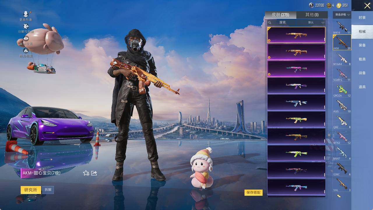 AKM-甜心宝贝,AKM-炫紫旋律,AKM-盖世英雄,SCAR-L-童趣迷兔,SCAR-L-机甲封神,M416-心之恋语,M416-至情至圣,GROZA-香水柠檬,AUG-星之彼岸,AUG-许七安,M762-甜蜜誓约,UMP45-恐龙拽拽,Vector-环太平洋,汤姆逊-怪笑疯兔,AKS-74U-信仰神谕,Kar98K-巳巳如意,AWM-焰龙焚天,DP-28-千金淑猫,MG3-洛神天依