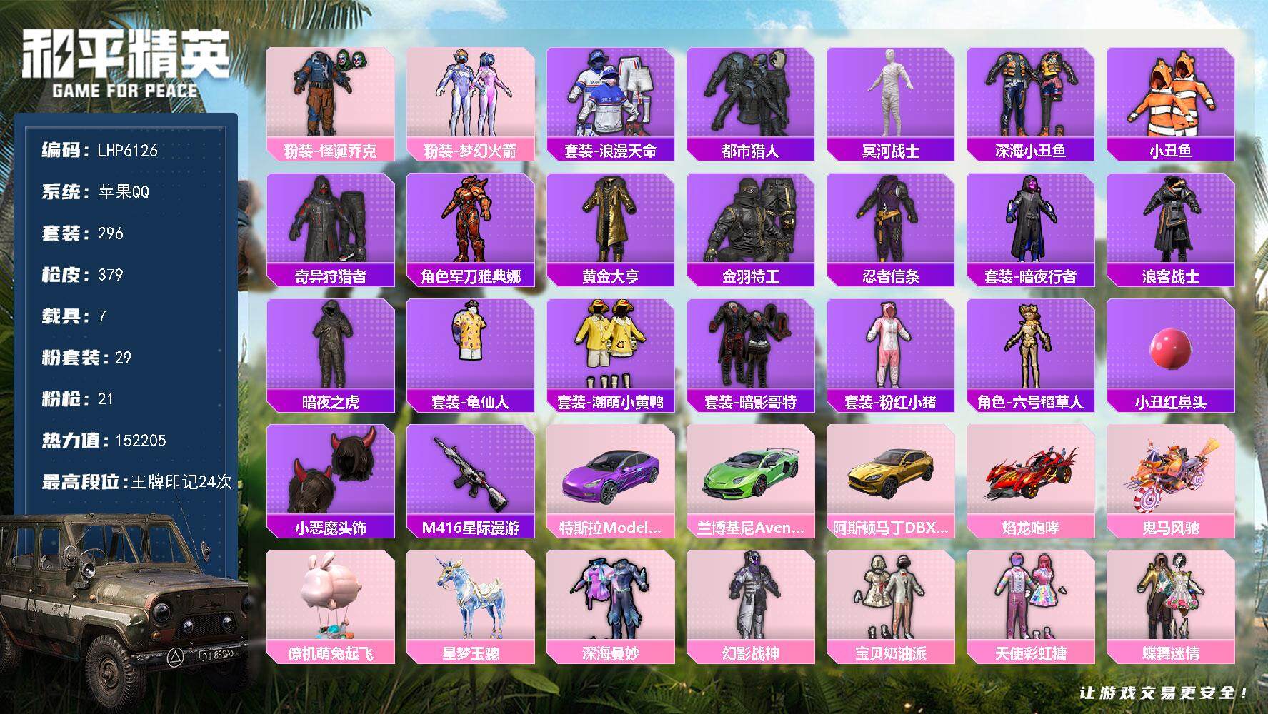 [13685793]可二次【店主推荐捡漏号!可直接换绑】/素材身法号/老木乃伊/M416-至情至圣(九级)/绝世印记1 苹果 手Q-29粉装-21特效枪-7载具-6粉色飞行器-15.2w热力值-24王牌印记-296套装-379枪皮【热门品类】:粉装-怪诞乔克,粉装-梦幻火箭,套装-浪漫天命,套装-都市猎人,套装-冥河战士,套装-深海小丑鱼,套装-小丑鱼,套装-奇异狩猎者,角色-军刀雅典娜,套装-黄金大亨,套装-金羽特工,套装-忍者信条,套装-暗夜行者,套装-浪客战士,套装-暗夜之虎,套装-龟仙人,套装-潮萌小黄鸭,套装-暗影哥特,套装-粉红小猪,角色-六号稻草人,小丑红鼻头,小恶魔头饰,M416-星际漫游【粉色载具】:特斯拉Model 3(奇幻紫),兰博基尼Aventador SVJ(翡翠绿),阿斯顿马丁DBX(金),焰龙咆哮,鬼马风驰,僚机-萌兔起飞,星梦玉骢【粉色套装】:粉装-深海曼妙,粉装-幻影战神,粉装-怪诞乔克,粉装-宝贝奶油派,粉装-天使彩虹糖,粉装-蝶舞迷情,粉装-梦幻火箭,粉装-智能音符,粉装-俏皮狐尾,粉装-绚金战神,粉装-冰霜白皇,粉装-炙焰红王,粉装-香水柠檬,粉装-星之彼岸,粉装-银龙傲海,粉装-骨龙祭渊,粉装-暗夜玫瑰,角色-洛天依,角色-2号机款机体服,粉装-碧影闪光,粉装-赤焰黑爵,粉装-闪光银龙,角色-复仇流浪者,粉装-垂柳戏鸭,粉装-寒光使者,角色-星梦奇缘,角色-千金淑猫,粉装-幻彩电音,角色-羊梦糖心【粉色枪皮等级】:AKM-甜心宝贝(七级),AKM-炫紫旋律(一级),AKM-盖世英雄(五级),SCAR-L-童趣迷兔(五级),SCAR-L-机甲封神(一级),M416-心之恋语(一级),M416-至情至圣(九级),GROZA-香水柠檬(五级),AUG-星之彼岸(一级),AUG-许七安(五级),M762-甜蜜誓约(五级),UMP45-恐龙拽拽(五级),Vector-环太平洋(五级),汤姆逊-怪笑疯兔(五级),AKS-74U-信仰神谕(五级),Kar98K-巳巳如意(五级),AWM-焰龙焚天(五级),DP-28-千金淑猫(五级),DP-28-豹影疾电(五级),MG3-洛神天依(五级),破片手榴弹-瓶中星球(六级)【粉色飞行器】:炫紫旋律飞行器,星之彼岸飞行器,焰龙焚天飞行器,闪光银龙飞行器,镜域双华-灵镜之阶,星梦奇缘飞行器