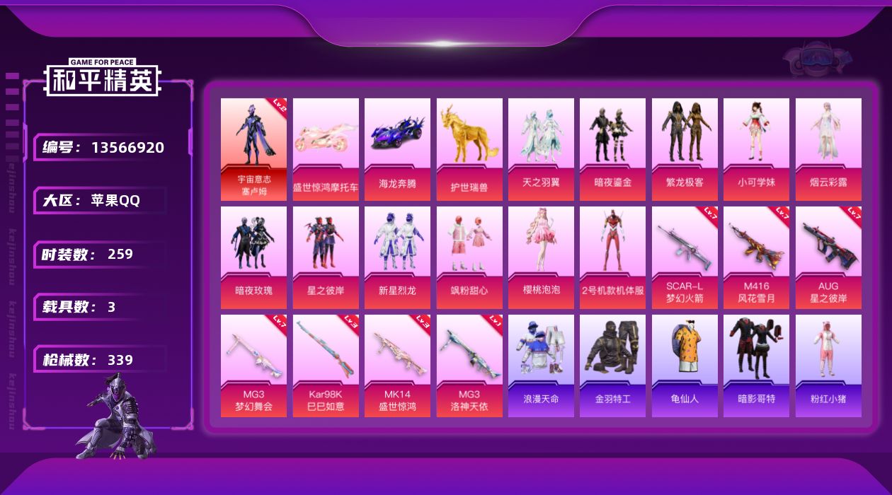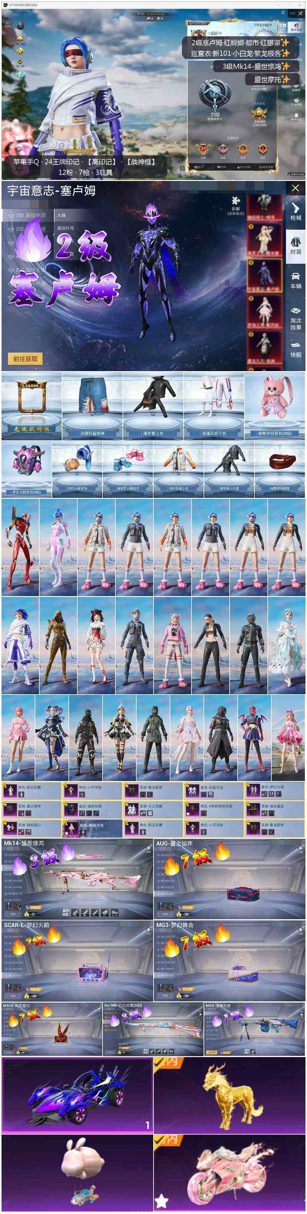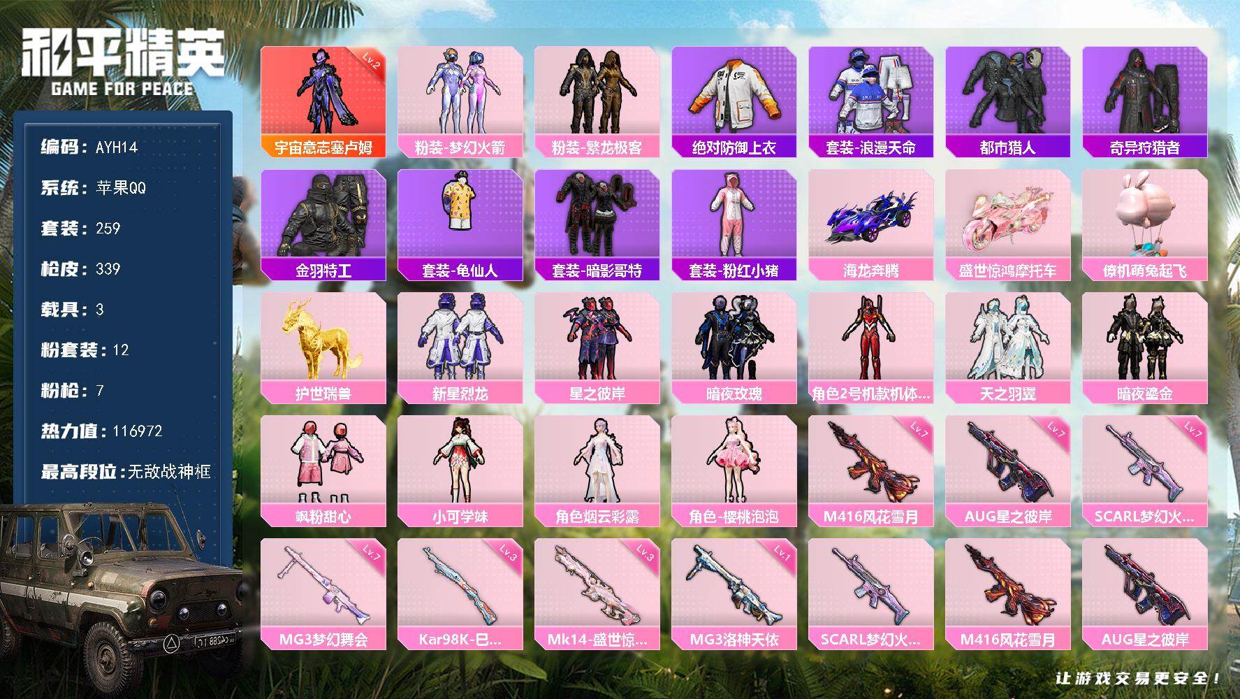 [13566920]【店主推荐捡漏号!可直接换绑】苹果 手Q-无敌战神框-1神装-12粉装-7特效枪-3载具-7粉色飞行器-116972热力值-24王牌印记-259套装-339枪皮【红色神装等级】:宇宙意志-塞卢姆(二级)【红色角色神装】:宇宙意志-塞卢姆【热门品类】:粉装-梦幻火箭,粉装-繁龙极客,绝对防御上衣,套装-浪漫天命,套装-都市猎人,套装-奇异狩猎者,套装-金羽特工,套装-龟仙人,套装-暗影哥特,套装-粉红小猪【粉色载具】:海龙奔腾,盛世惊鸿摩托车,僚机-萌兔起飞,护世瑞兽【粉色套装】:粉装-梦幻火箭,粉装-新星烈龙,粉装-星之彼岸,粉装-暗夜玫瑰,角色-2号机款机体服,粉装-天之羽翼,粉装-暗夜鎏金,粉装-飒粉甜心,角色-小可学妹,粉装-繁龙极客,角色-烟云彩露,角色-樱桃泡泡【粉色枪皮等级】:SCAR-L-梦幻火箭(七级),M416-风花雪月(七级),AUG-星之彼岸(七级),Kar98K-巳巳如意(三级),Mk14-盛世惊鸿(三级),MG3-洛神天依(一级),MG3-梦幻舞会(七【粉色枪皮】:SCAR-L-梦幻火箭,M416-风花雪月,AUG-星之彼岸,Kar98K-巳巳如意,Mk14-盛世惊鸿,MG3-洛神天依,MG3-梦幻舞会【粉色飞行器】:梦幻火箭飞行器,星之彼岸飞行器,天之羽翼飞行器,太空嘟嘟飞行器,千面幻镜飞行器,深渊漩涡飞行器,凤舞九天飞行器