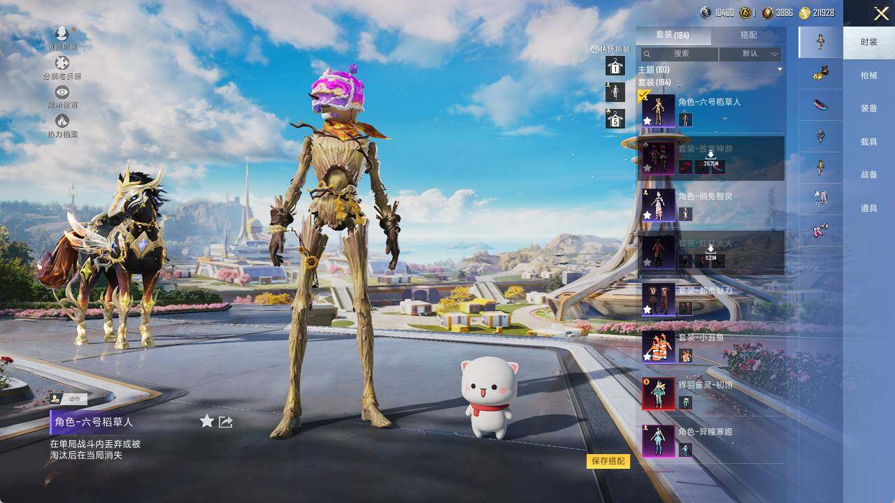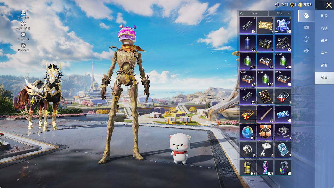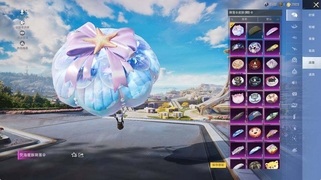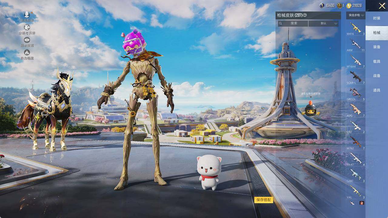AKM-绿萝繁花,AKM-幽焰骑士,M416-暖熊萌萌,GROZA-镜光银凌,AUG-暖羊咩咩,UMP45-量子极限,AKS-74U-信仰神谕,P90-粉樱探戈,Kar98K-巳巳如意,M24-莲影清波,AMR-炫光之旅