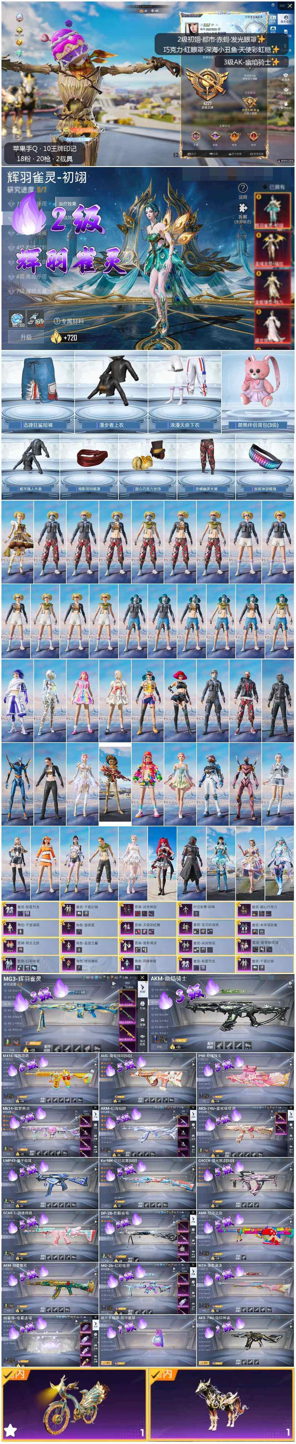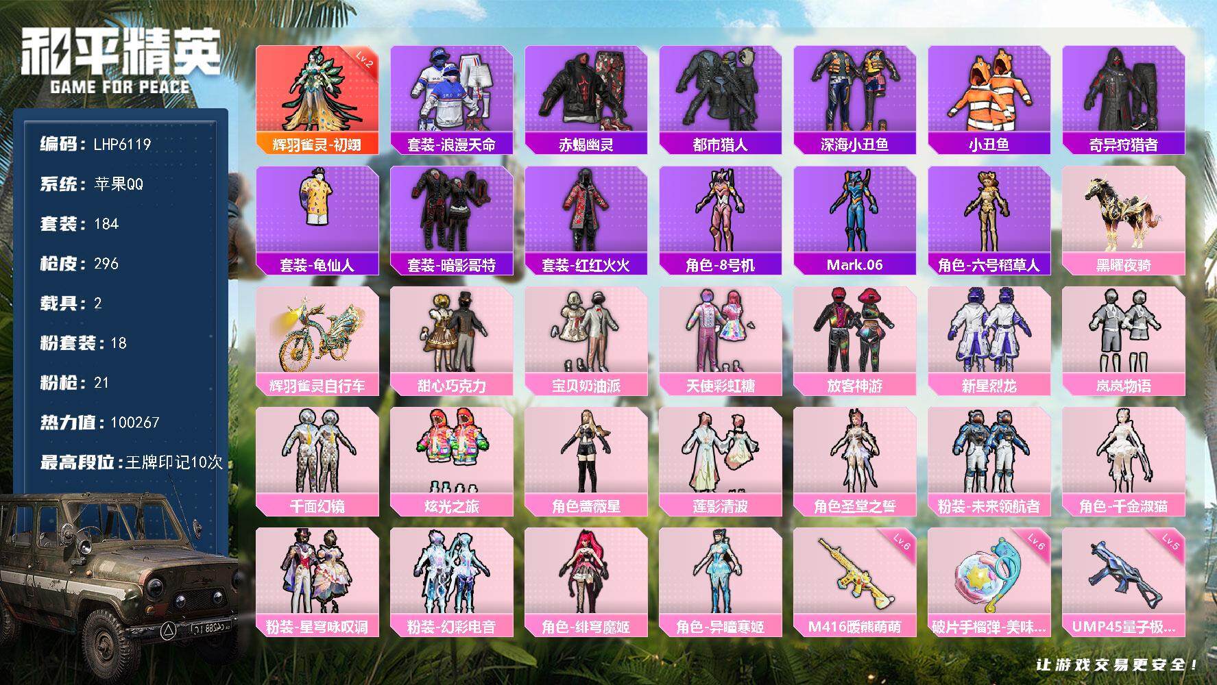 [13685933]【店主推荐捡漏号!可直接换绑】/素材身法号/绝世印记2 苹果 手Q-1神装-18粉装-21特效枪-2载具-9粉色飞行器-10w热力值-10王牌印记-184套装-296枪皮【红色神装等级】:辉羽雀灵-初翊(二级)【热门品类】:套装-浪漫天命,套装-赤蝎幽灵,套装-都市猎人,套装-深海小丑鱼,套装-小丑鱼,套装-奇异狩猎者,套装-龟仙人,套装-暗影哥特,套装-红红火火,角色-8号机,角色-Mark.06,角色-六号稻草人【粉色载具】:黑曜夜骑,辉羽雀灵自行车【粉色套装】:粉装-甜心巧克力,粉装-宝贝奶油派,粉装-天使彩虹糖,粉装-放客神游,粉装-新星烈龙,粉装-岚岚物语,粉装-千面幻镜,粉装-炫光之旅,角色-蔷薇星,粉装-莲影清波,角色-圣堂之誓,粉装-未来领航者,角色-千金淑猫,粉装-星穹咏叹调,粉装-幻彩电音,角色-绯穹魔姬,角色-异瞳寒姬【粉色枪皮等级】:AKM-绿萝繁花(五级),AKM-幽焰骑士(三级),AKM-幻海仙踪(五级),SCAR-L-锦绣绵绵(五级),M416-暖熊萌萌(六级),GROZA-镜光银凌(五级),AUG-暖羊咩咩(五级),UMP45-量子极限(五级),AKS-74U-信仰神谕(一级),AKS-74U-星穹咏叹调(五级),P90-粉樱探戈(五级),Kar98K-巳巳如意(五级),M24-莲影清波(四级),Mk14-甜梦熊击(五级),AMR-炫光之旅(五级),DP-28-豹影疾电(五级),MG3-辉羽雀灵(三级),MG-36-幻彩电音(四级),烟雾弹-电雾迷城(四级),破片手榴弹-瓶中星球(一级),破片手榴弹-美味星星糖(六级)【粉色飞行器】:齐天大圣飞行器,沙丘之主天马,花傲天飞行器,幽焰列车飞行器,雀灵庇佑飞行器,终晖之翼飞行器,灵猫魔法师飞行器,飞天猪飞行器