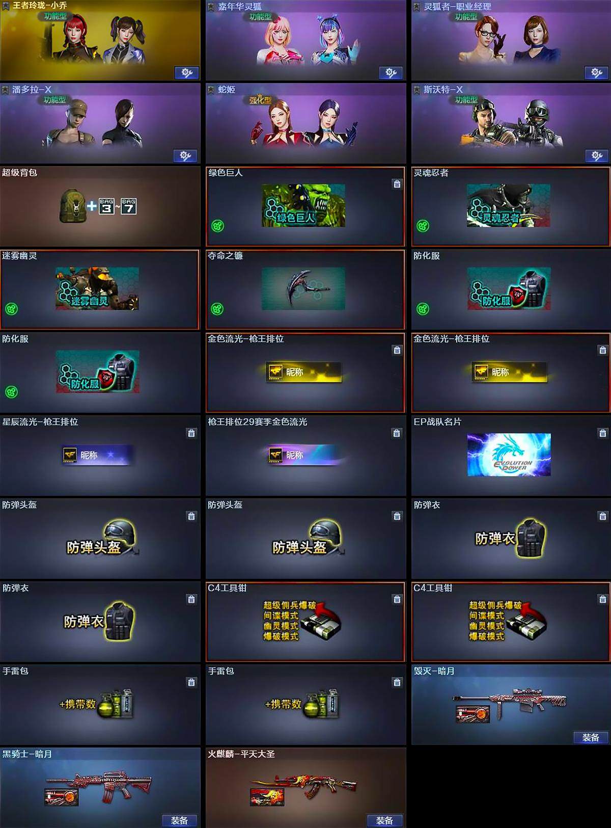 【道具】:超级背包,绿色巨人,灵魂忍者,迷雾幽灵,夺命之镰,防化服*2,金色流光-枪王排位*2,星辰流光-枪王排位,枪王排位29赛季金色流光,EP战队名片,防弹头盔*2,防弹衣*2,C4工具钳*2,手雷包*2