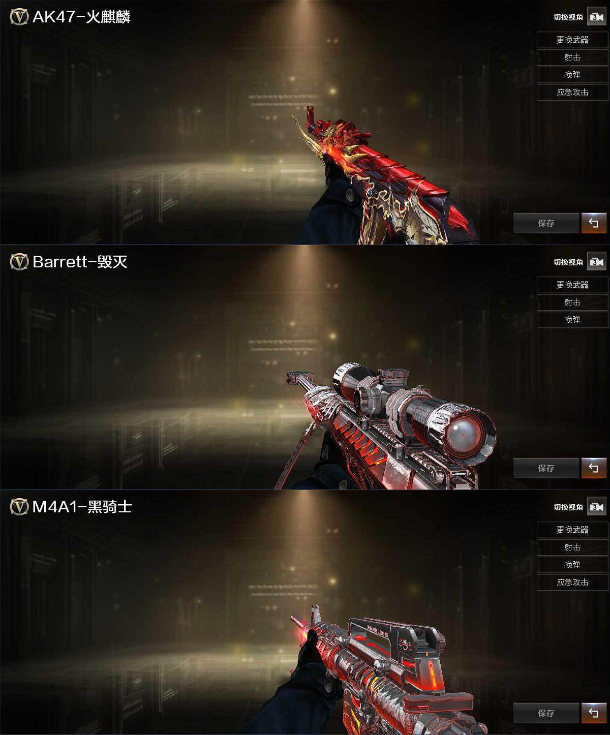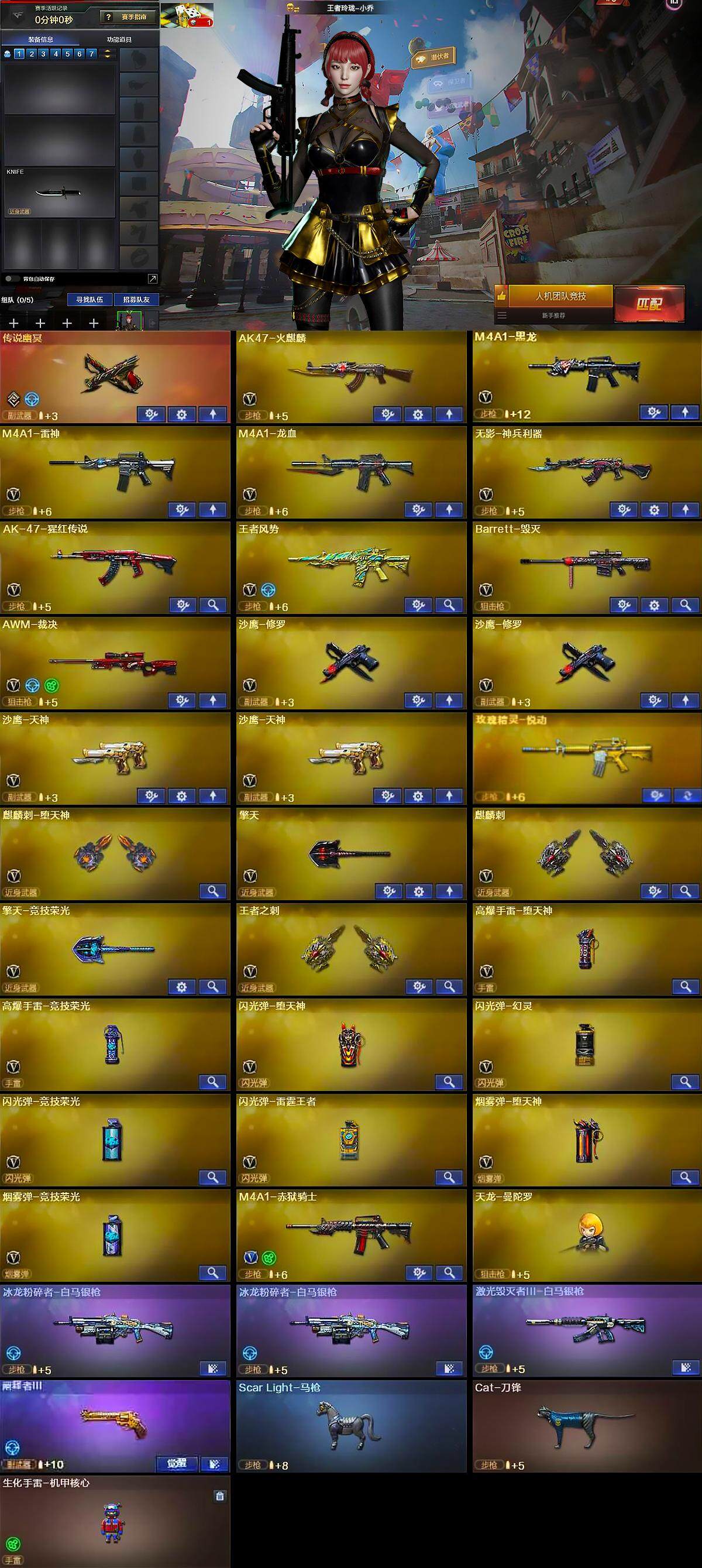【英雄级武器】:AK47-火麒麟,M4A1-黑龙,M4A1-雷神,M4A1-龙血,无影-神兵利器,AK-47-猩红传说,王者风势-觉醒版,Barrett-毁灭,AWM-裁决,沙鹰-修罗*2,沙鹰-天神*2,麒麟刺-堕天神,擎天,麒麟刺,擎天-竞技荣光,王者之刺-觉醒版,高爆手雷-堕天神,高爆手雷-竞技荣光,闪光弹-堕天神,闪光弹-幻灵,闪光弹-竞技荣光,闪光弹-雷霆王者-觉醒版,烟雾弹-堕天神,烟雾弹-竞技荣光,M4A1-赤狱骑士
