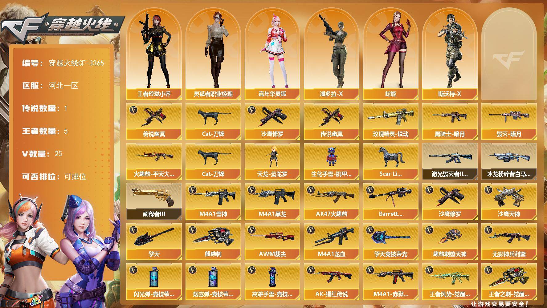 [13584570]河北一区-25V-5王者-0炫金 【传说武器】:传说幽冥 【热门武器】:传说幽冥,Cat-刀锋,沙鹰-修罗*2 【王者炫金武器】:玫瑰精灵-悦动 【皮肤】:火麒麟-平天大圣,毁灭-暗月,黑骑士-暗月 【角色】:王者玲珑-小乔,嘉年华灵狐,灵狐者-职业经理,潘多拉-X,蛇姬,斯沃特-X 【人偶武器】:天龙-曼陀罗,Scar Light-马枪,Cat-刀锋,生化手雷-机甲核心 【挑战大师】:冰龙粉碎者-白马银枪*2,激光毁灭者III-白马银枪,阐释者III 【英雄级武器】:AK47-火麒麟,M4A1-黑龙,M4A1-雷神,M4A1-龙血,无影-神兵利器,AK-47-猩红传说,王者风势-觉醒版,Barrett-毁灭,AWM-裁决,沙鹰-修罗*2,沙鹰-天神*2,麒麟刺-堕天神,擎天,麒麟刺,擎天-竞技荣光,王者之刺-觉醒版,高爆手雷-堕天神,高爆手雷-竞技荣光,闪光弹-堕天神,闪光弹-幻灵,闪光弹-竞技荣光,闪光弹-雷霆王者-觉醒版,烟雾弹-堕天神,烟雾弹-竞技荣光,M4A1-赤狱骑士 【道具】:超级背包,绿色巨人,灵魂忍者,迷雾幽灵,夺命之镰,防化服*2,金色流光-枪王排位*2,星辰流光-枪王排位,枪王排位29赛季金色流光,EP战队名片,防弹头盔*2,防弹衣*2,C4工具钳*2,手雷包*2 【特殊枪械】: