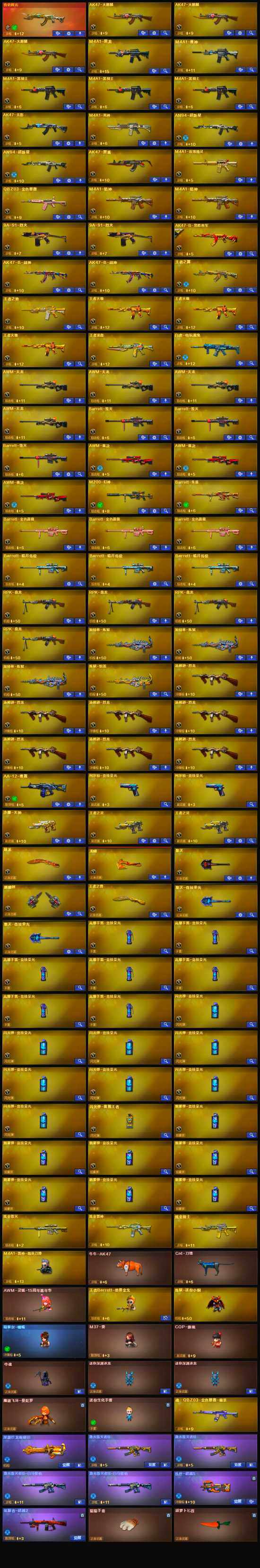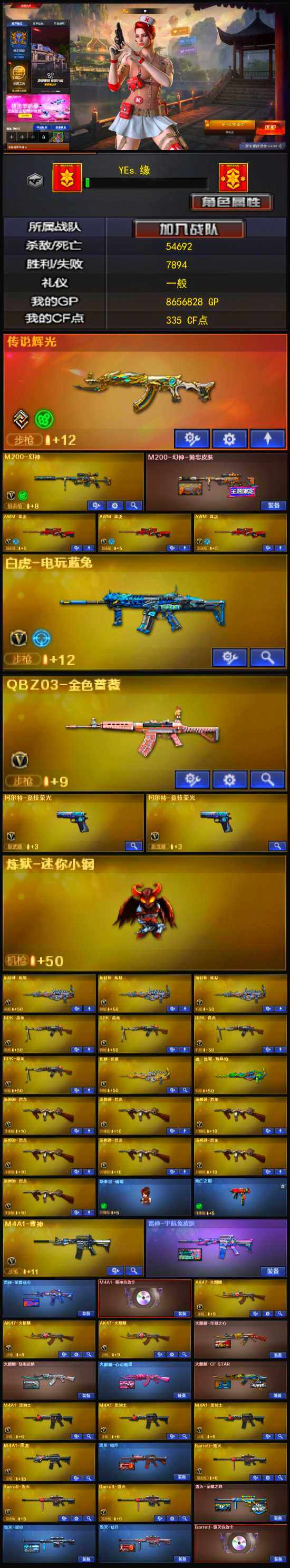 【热门武器】:传说辉光,QBZ03-金色蔷薇,M200-幻神,死亡之眼,白虎-电玩蓝兔,Cat-刀锋,炼狱-迷你小钢,牛牛-AK47,M4A1-黑骑士*3,汤姆逊-烈龙*7,RPK-盘龙*4,加特林-炼狱*3,斯泰尔-蝴蝶,王者M4A1-萌萌金发刀锋,金刚伞
