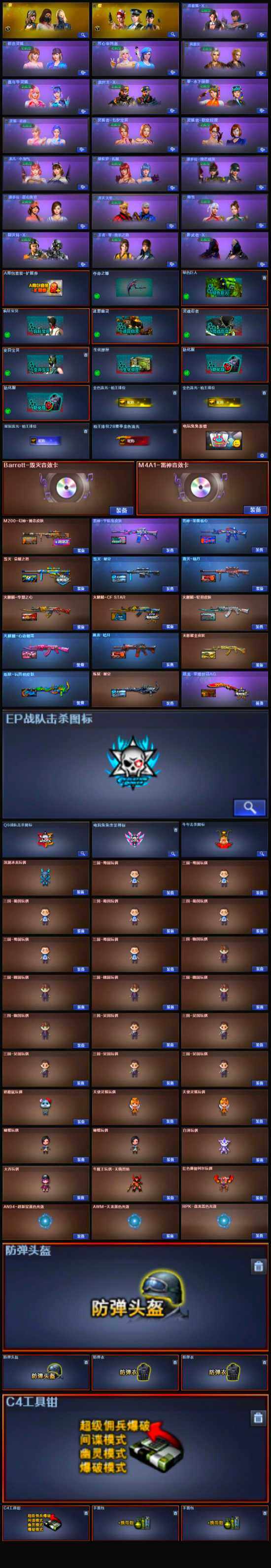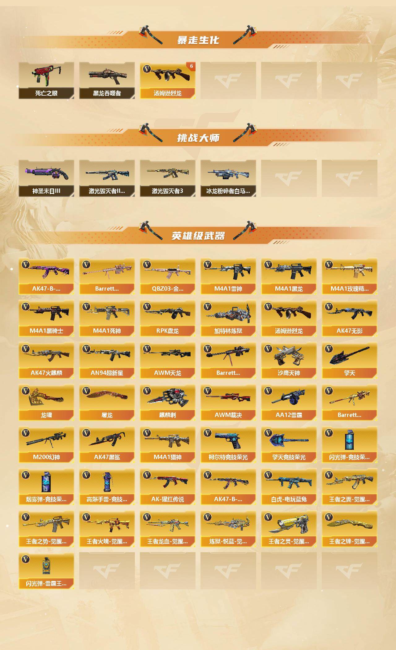 【英雄级武器】:AK47-火麒麟*3,M4A1-黑龙,M4A1-雷神,M4A1-黑骑士*3,AK47-无影,M4A1-死神,AN94-超新星*2,AK47-黑鲨,M4A1-玫瑰精灵,QBZ03-金色蔷薇,M4A1-猎神*2,王者之翼-觉醒版,王者之势-觉醒版,AK-47-猩红传说*2,AK47-B-战神*2,王者火魄-觉醒版*3,AK47-B-常胜将军,王者龙血-觉醒版,白虎-电玩蓝兔,AWM-天龙*4,Barrett-