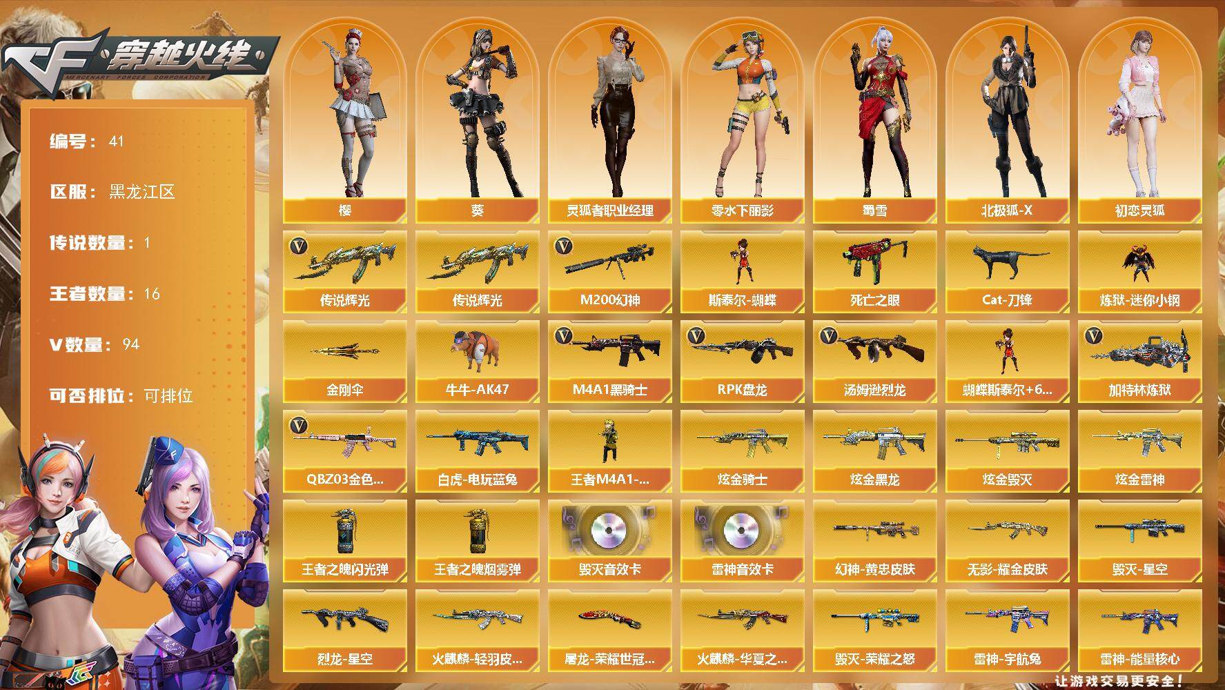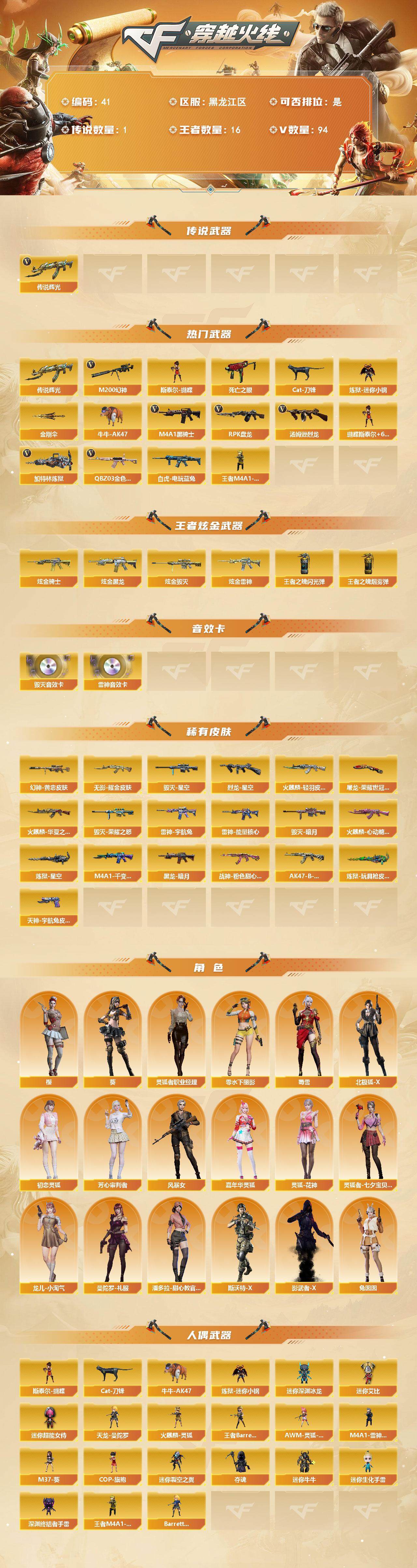 [13623850]黑龙江区-94V-16王者-5炫金 【传说武器】:传说辉光 【热门武器】:传说辉光,QBZ03-金色蔷薇,M200-幻神,死亡之眼,白虎-电玩蓝兔,Cat-刀锋,炼狱-迷你小钢,牛牛-AK47,M4A1-黑骑士*3,汤姆逊-烈龙*7,RPK-盘龙*4,加特林-炼狱*3,斯泰尔-蝴蝶,王者M4A1-萌萌金发刀锋,金刚伞 【王者炫金武器】:炫金骑士,炫金黑龙*2,炫金雷神,炫金毁灭,王者之魄闪光弹*2,王者之魄烟雾弹 【音效卡】:M4A1-雷神音效卡,Barrett-毁灭音效卡 【皮肤】:M200-幻神-黄忠皮肤,烈龙-星空,雷神-能量核心,雷神-宇航兔皮肤,火麒麟-华夏之心,火麒麟-轻羽皮肤,火麒麟-心动糖果,毁灭-暗月,毁灭-荣耀之怒,毁灭-星空,M4A1-千变-孔明皮肤,黑龙-暗月,无影耀金皮肤,战神-粉色甜心皮肤,AK47-B-常胜将军-刘备,炼狱-星空,炼狱-玩具枪皮肤,天神-宇航兔皮肤,屠龙-荣耀世冠AG 【角色】:葵,樱,北极狐-X,初恋灵狐,芳心审判者,风暴女,嘉年华灵狐,零-水下丽影,灵狐-花神,灵狐者-七夕宝贝,灵狐者-职业经理,龙儿-小淘气,曼陀罗-礼服,潘多拉-甜心教官,斯沃特-X,蜀雪,兔囡囡,影武者-X 【人偶武器】:王者M4A1-萌萌金发刀锋,天龙-曼陀罗,火麒麟-灵狐,王者Barrett-英勇金戈,M4A1-雷神-精英刀锋,炼狱-迷你小钢,斯泰尔-蝴蝶,AWM-灵狐-15周年嘉年华,M37-葵,COP-旗袍,Cat-刀锋,牛牛-AK47,迷你深渊冰龙*2,迷你裂空之翼*2,夺魂,迷你牛牛*3,迷你生化手雷,深渊终结者手雷,Barrett-曼陀罗,迷你艾比,迷你超能女侍 【暴走生化】:黑龙吞噬者,死亡之眼 【挑战大师】:冰龙粉碎者-白马银枪*2,激光毁灭者III-白马银枪*2,激光毁灭者III*2,神圣爆裂者-末日III 【英雄级武器】:AK47-火麒麟*3,M4A1-黑龙,M4A1-雷神,M4A1-黑骑士*3,AK47-无影,M4A1-死神,AN94-超新星*2,AK47-黑鲨,M4A1-玫瑰精灵,QBZ03-金色蔷薇,M4A1-猎神*2,王者之翼-觉醒版,王者之势-觉醒版,AK-47-猩红传说*2,AK47-B-战神*2,王者火魄-觉醒版*3,AK47-B-常胜将军,王者龙血-觉醒版,白虎-电玩蓝兔,AWM-天龙*4,Barrett-