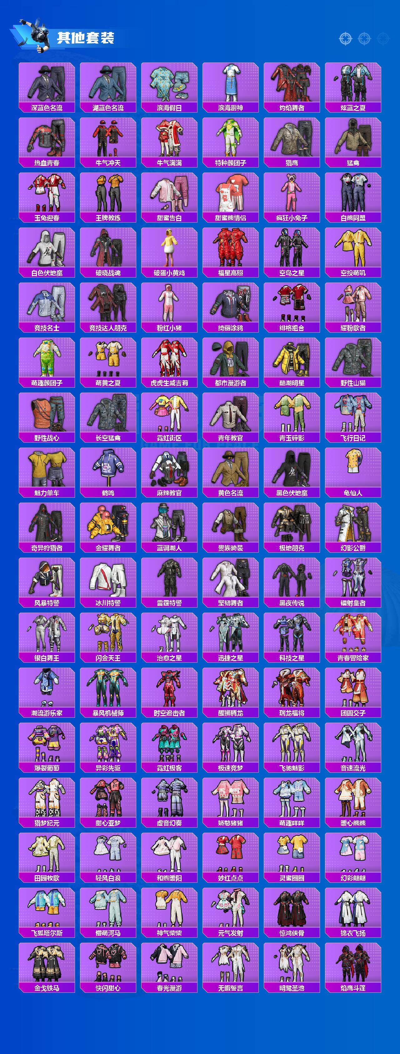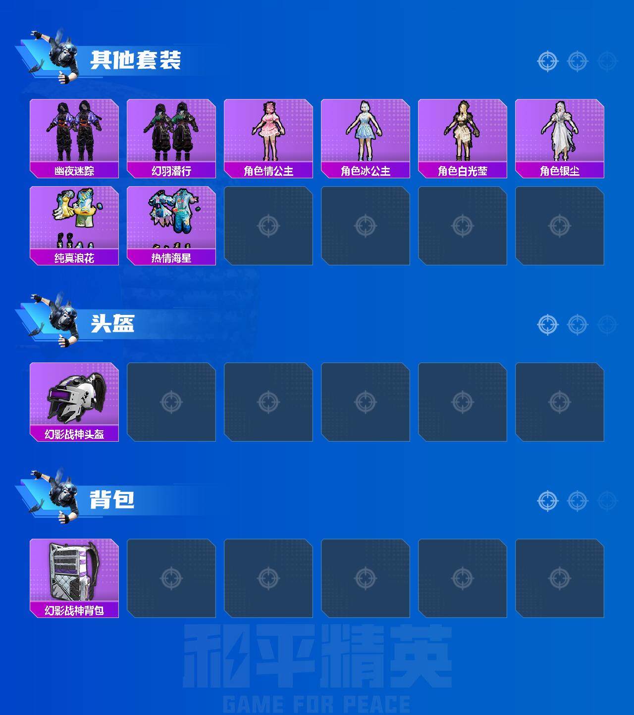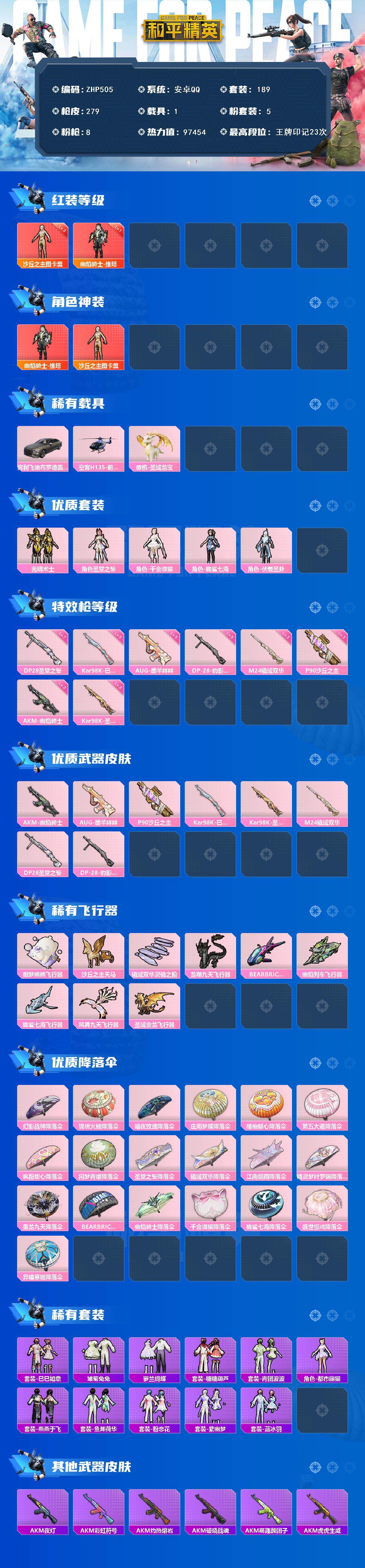 - [12061423]4粉装 11特效枪 2载具 15印记 可二次 可修改实名 身法装备:暗影哥特(红眼罩),Mark.06(新蓝螳螂) 优质装备:辉羽雀灵自行车,特斯拉Roadster(水滴蓝),六级Kar98K-创世·救赎,Kar98K创世·救赎,P90-金丰海韵,七级P90-金丰海韵,M762-青锋波束,GROZA-镜光银凌,智耀战神,AUG-圣斗士星矢,星穹咏叹调,AKS-74U-星穹咏叹调,MK14-甜梦熊击,Mk14-爆裂游戏,Kar98K-巳巳如意 热门装扮:暗夜玫瑰,金丰海韵,呆萌铁蟹 稀有枪皮:MG-36-沧焰双生,DP-28-豹影疾电 五级特效枪:五级M762-青锋波束,五级GROZA-镜光银凌,五级Kar98K-巳巳如意,五级m14爆裂游戏,五级DP-28-豹影疾电,五级MG-36-沧焰双生,五级MK14-甜梦熊击,五级AUG-圣斗士星矢 四级特效枪:四级AKS-74U-星穹咏叹调 紫色装扮:SS23特训,虚空漩涡,SS30特训套装,SS31特训套装,云朵鹅,雪绒豹,SS33特训套装,旭日情侣,诡诞巡游,SS21特训,田园牧歌,轻风白浪,和煦暖阳,SS22特训,顶瓜瓜,混沌火种,冷焰舞者,吉莉礼服,夏日音浪,完美偶像,帅气教官,幻影武者,冰川特警,灵公主,人气偶像,SS16特训,瑞龙福将,团圆交子,SS17特训,治愈之星,科技之星,SS14特训,萌趣颜团子,特种颜团子,青春冒险家,潮流游乐家,SS15特训,蝎王蛇后,SS20特训,竞技角斗士,异彩先驱,SS18特训,SS19特训,战地菁英,黄色名流,青年教官,风暴特警,飞行日记,骑行爱好者,魅力单车,鹤鸣,麻辣教官,黄色伏地魔,黄色运动,黑色伏地魔,龙的传人,龟仙人,冰河战士,龙魂突击队,蝶变,酷潮明星,霓虹极客,野性战心,长空猛禽,雨林探路者,银刃勇者大衣,熔岩游骑兵连帽夹克,无面战甲,绛羽幽主,街头潮人,深蓝色名流,湖蓝色名流,灰色格斗者,灼焰舞者,炫蓝之夏,热血青春,牛气冲天,牛气满满,海岛探路者,战地督导,探宝勇士,极地朋克,柠萌假日,格斗先锋,橘黑制服,沙漠毒蛇,竞技达人朋克,红色运动,绮丽涂鸦,缤纷果语,蓝彩潮人,蓝色运动,虎虎生威吉莉,空投萌叽,特殊使命,特训学院,狂沙舞者,猎鹰,猛禽,王牌教练,甜蜜告白,甜蜜熊情侣,空岛之星,白熊同盟,白色伏地魔,破晓战魂,破蛋小黄鸡,福星高照,萝兰蝴蝶,SS2